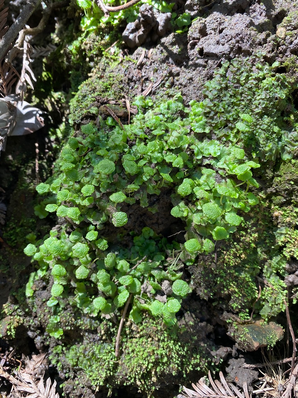 On the damp bank of the trail, I spot something whimsical – little green umbrellas growing from some tiny liverworts on the soil. iNaturalist has helped identify it as Cryptomitrium tenerum, a member of the Complex Thallose Liverworts (order Marchantiales).