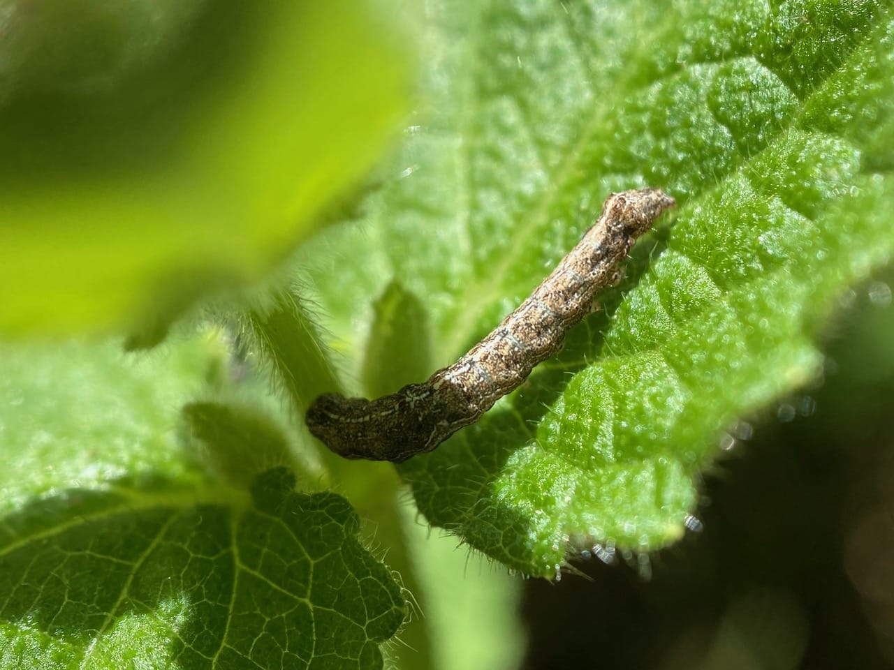 Something that looks like a bit of plant debris resting on a Wood Mint leaf turns out to be a small brown caterpillar on closer inspection. Probably some kind of moth?