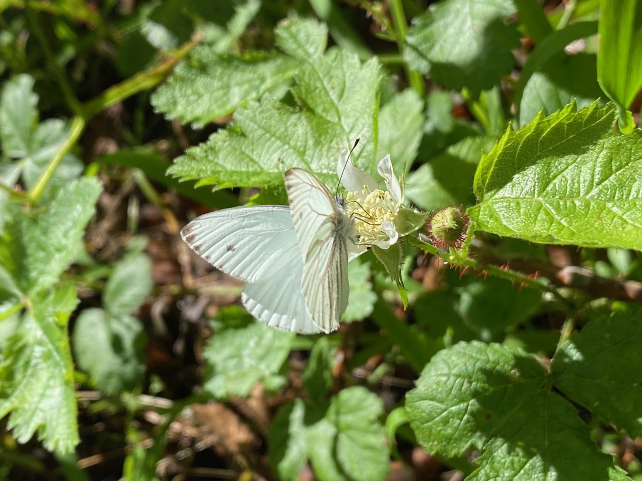 A male Cabbage White butterfly lands on a male California Blackberry flower. Note the long, flexible proboscis that it is using to probe for nectar. (The sexes of the butterfly can be distinguished by the black spots on the forewings – males have a single spot, while the females have two.)