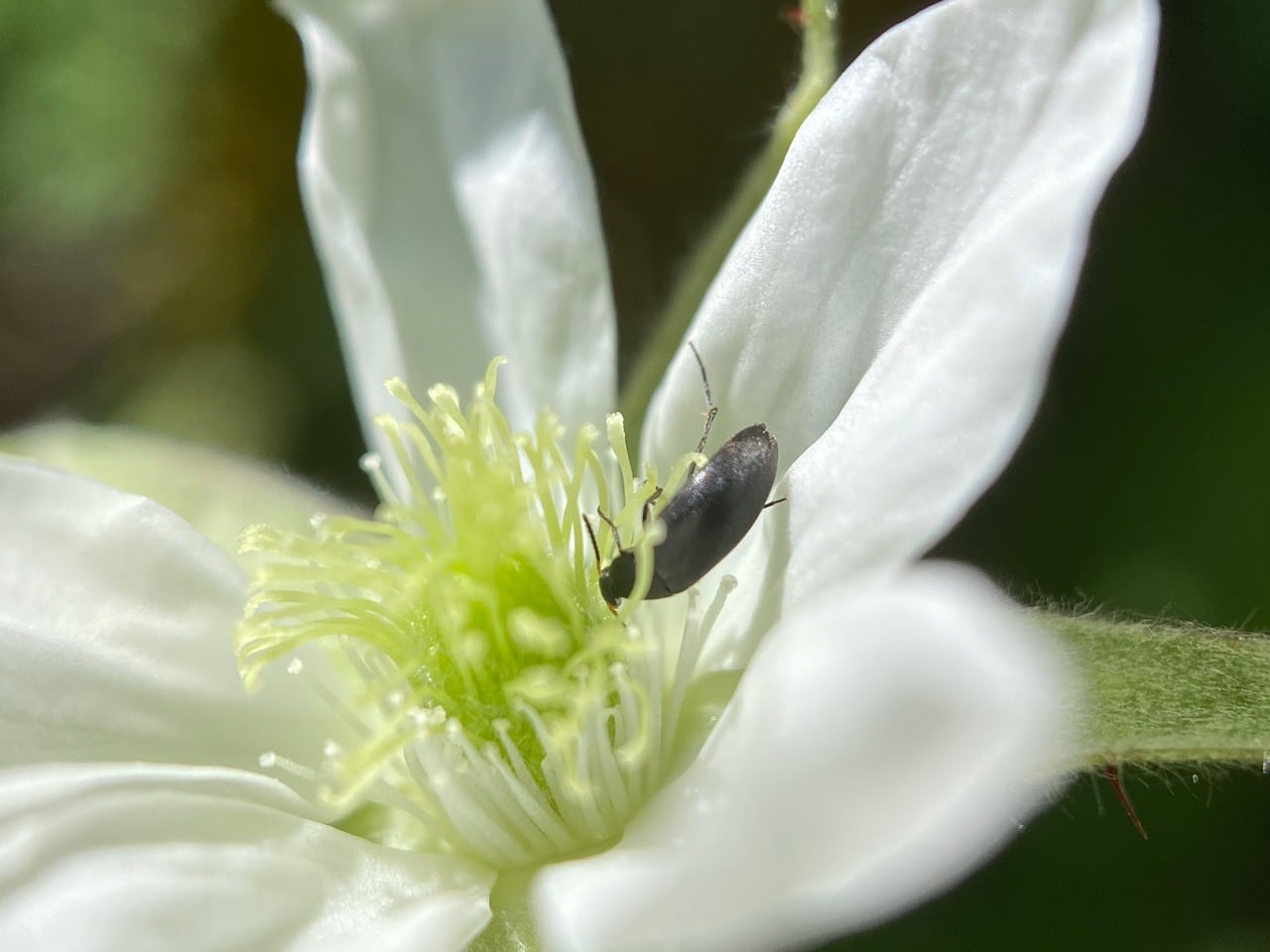 A Soft-winged Flower Beetle, Listrus sp. (family Melyridae, subfamily Dasytinae) is foraging among the pistils of a female California Blackberry. I wonder what it is looking for – there is no pollen here.