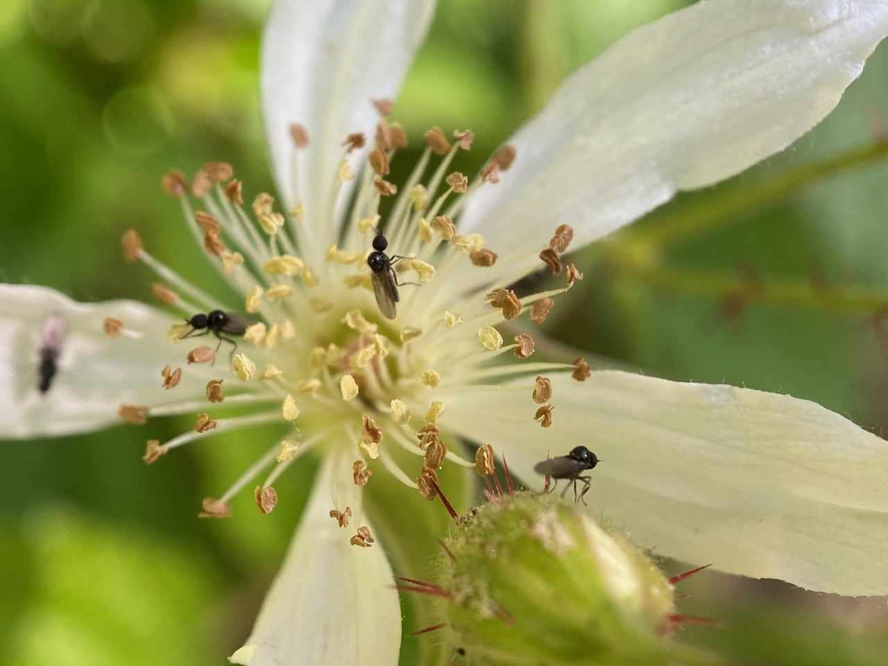 Some Hybotid Dance Flies (family Hybotidae) are foraging on a fading male California Blackberry flower. The stamens mature from the outside in, the anthers turning brown as they are emptied of pollen. Are the dance flies effective pollinators for the plant?