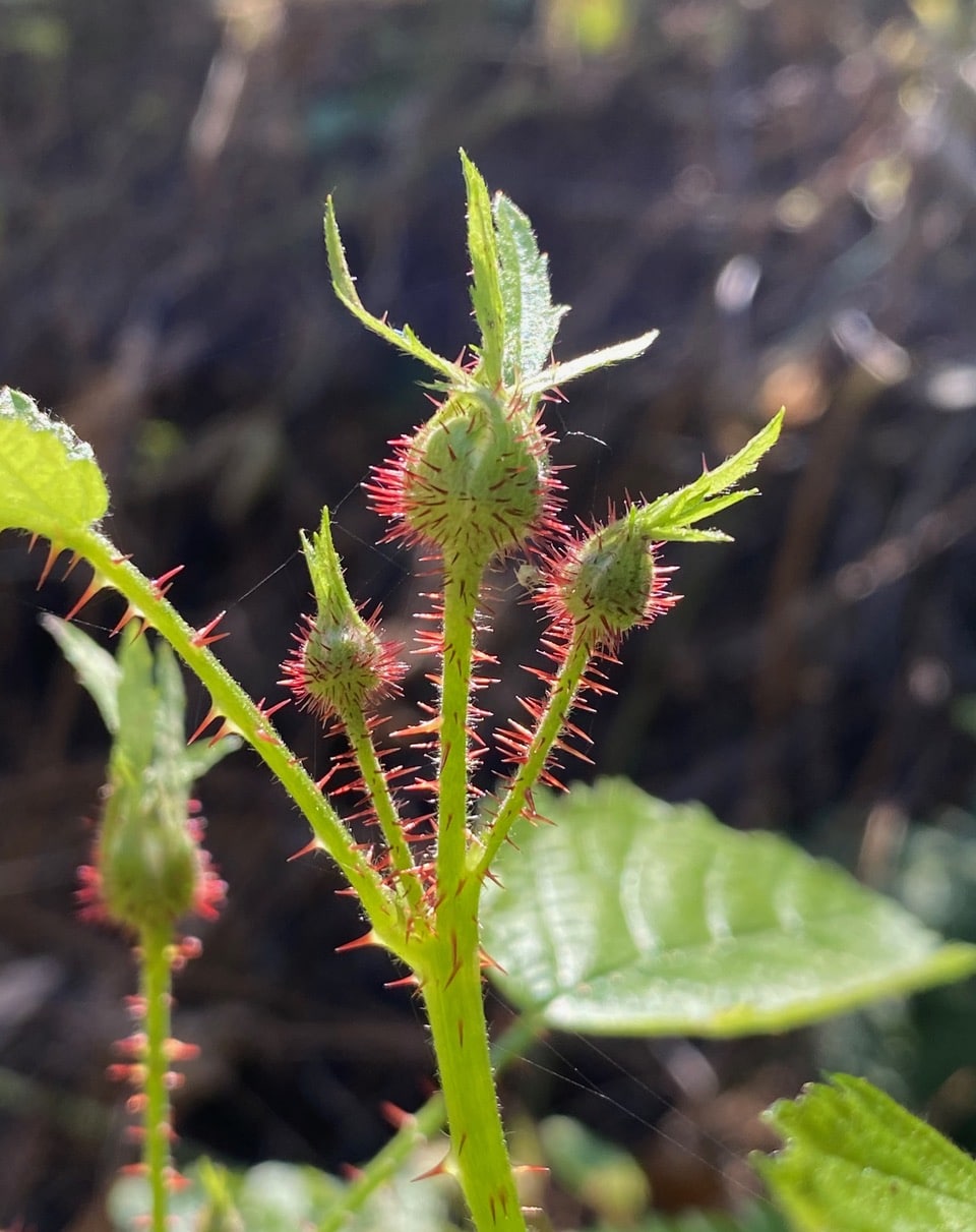 Pretty red thorns on the California Blackberry stems and flower buds are highlighted by the morning sun.