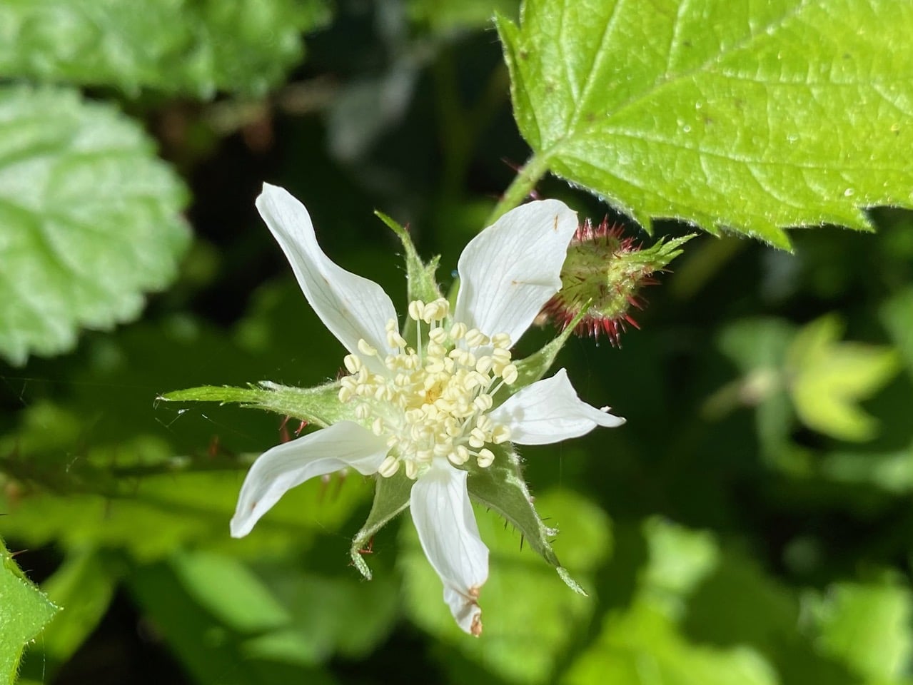 A fresh male flower of the California Blackberry, Rubus ursinus greets the morning sun. The plant is dioecious, male and female flowers are borne on separate plants. The center of male flowers is packed with numerous stamens, while the female flowers have pistils instead.
