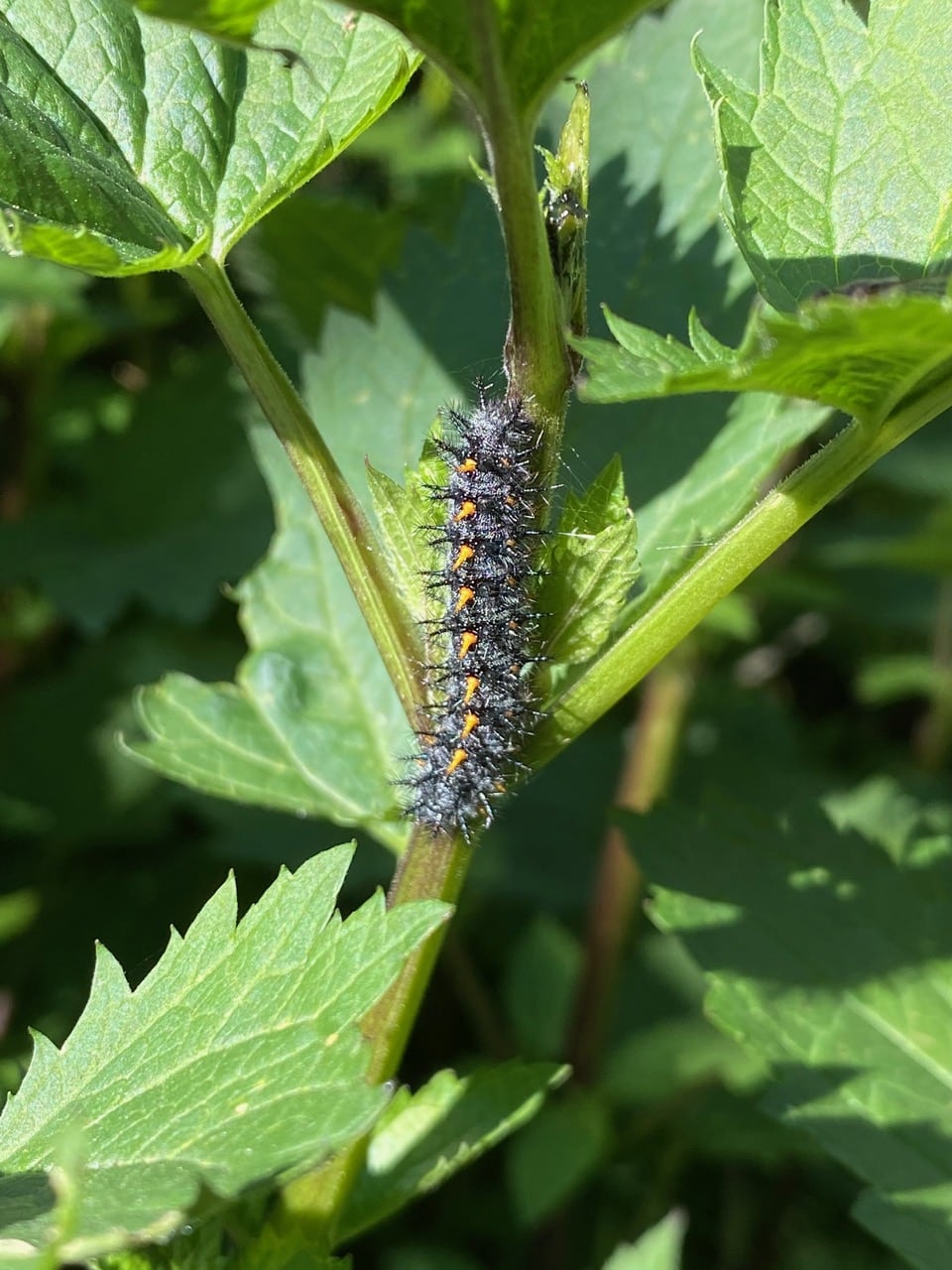 A robust stand of the California Bee Plant, Scrophularia californica is host to a few caterpillars of the Variable Checkerspot butterfly, Euphydryas Chalcedona (family Nymphalidae). These are some of the most mature caterpillars I have seen this year, almost ready to pupate.