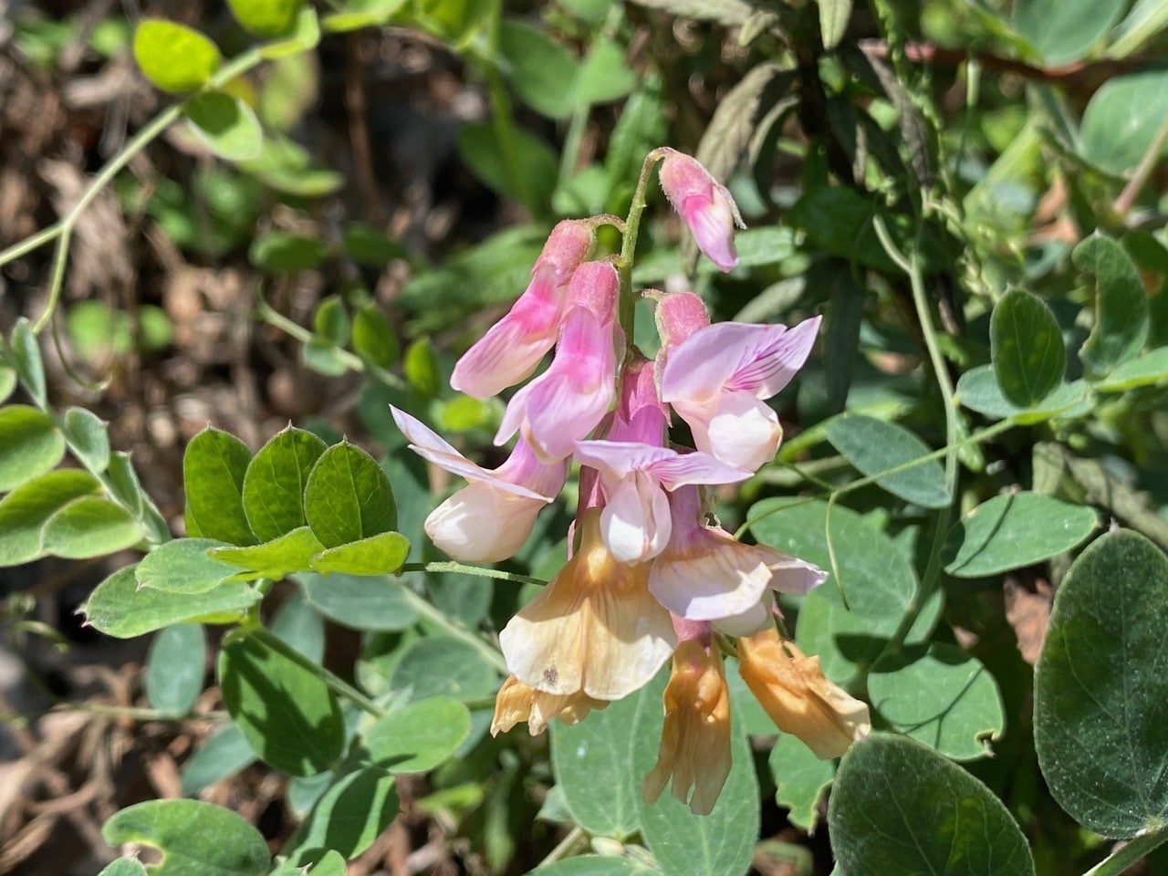 The Pacific Pea, Lathyrus vestitus is native to western North America, found mostly in the forests, woodlands, and chaparral of California. The perennial pea vine varies in appearance, ranging in color from bright violet, light to medium purple, or white. The grape-scented inflorescence is a showy array of up to 15 droopy pea flowers, sometimes densely packed together. The flower structure, with its banner, wings, and keel, is adapted to facilitate pollination by insects, notably bumble bees. Butterflies and moths who visit for nectar may also contribute to pollination. While insects are the primary pollinators, Pacific Pea can also be self-pollinated. The Pacific Pea is a host plant for certain butterfly larvae, such as the silvery blue and northern cloudywing.