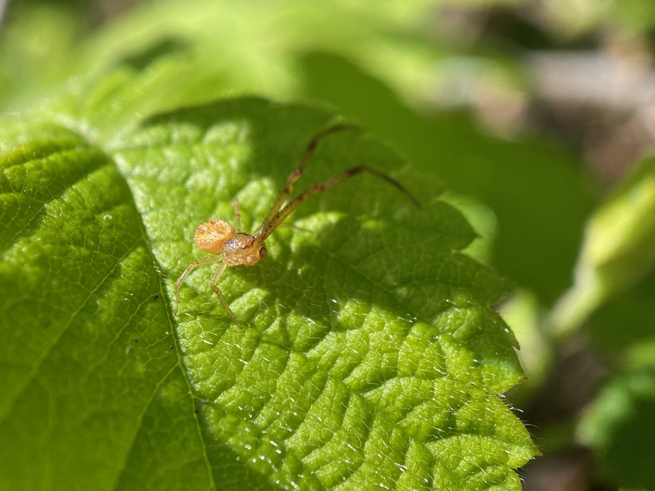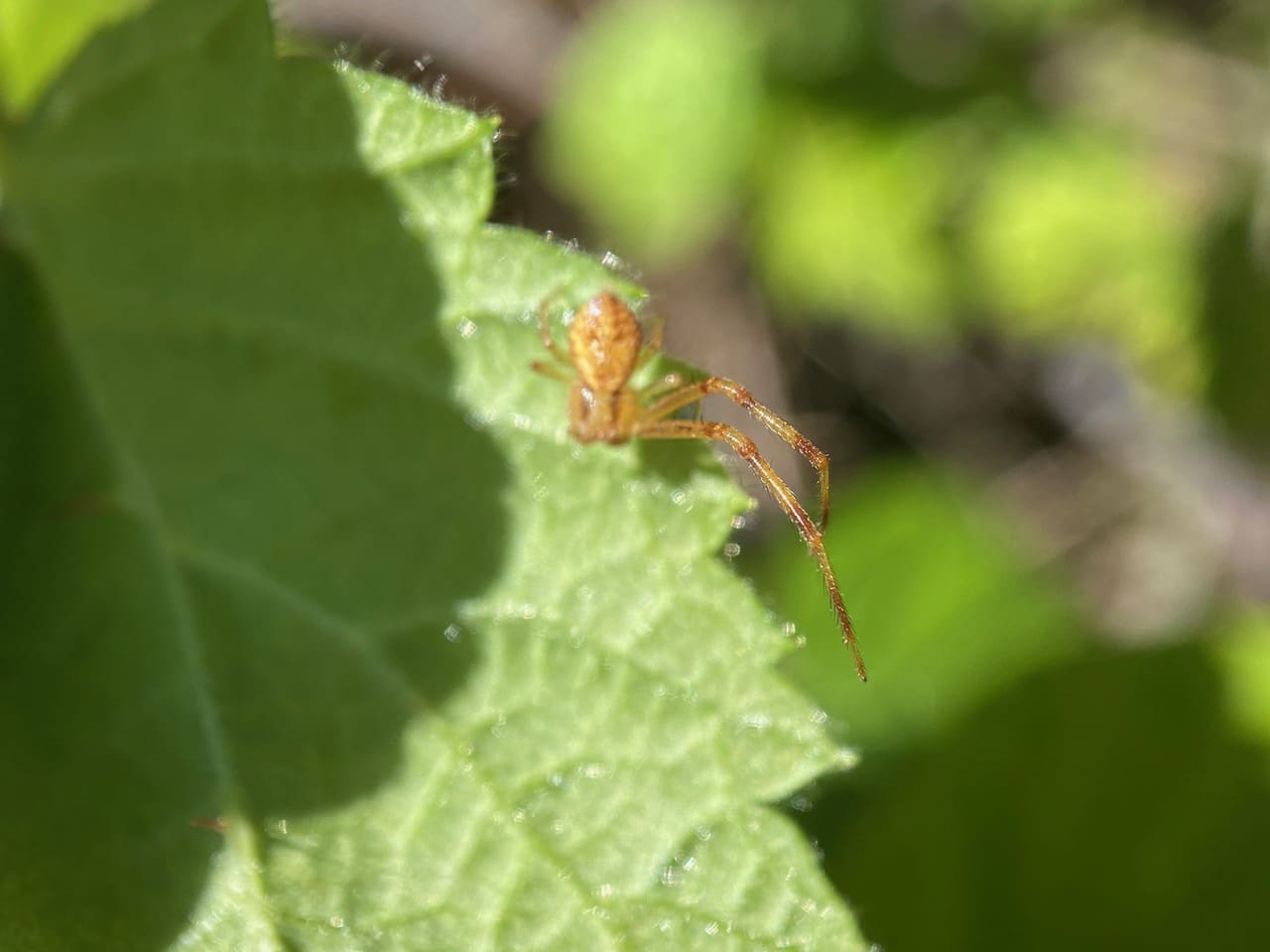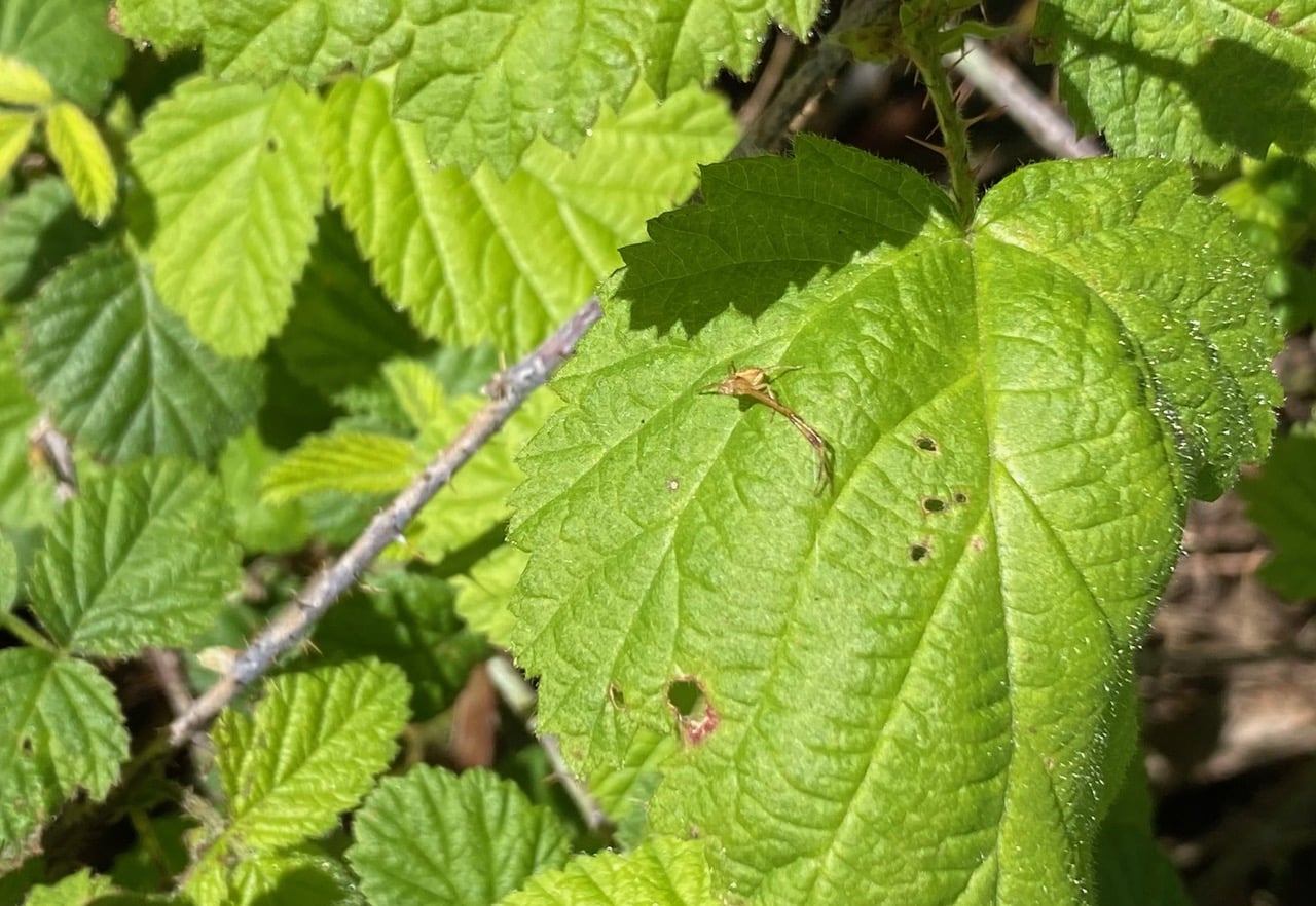 Wow, a tiny male Crab Spider (family Thomisidae) is stationed on a Blackberry leaf. What a startling and sad sight – it is completely missing its two right front legs!