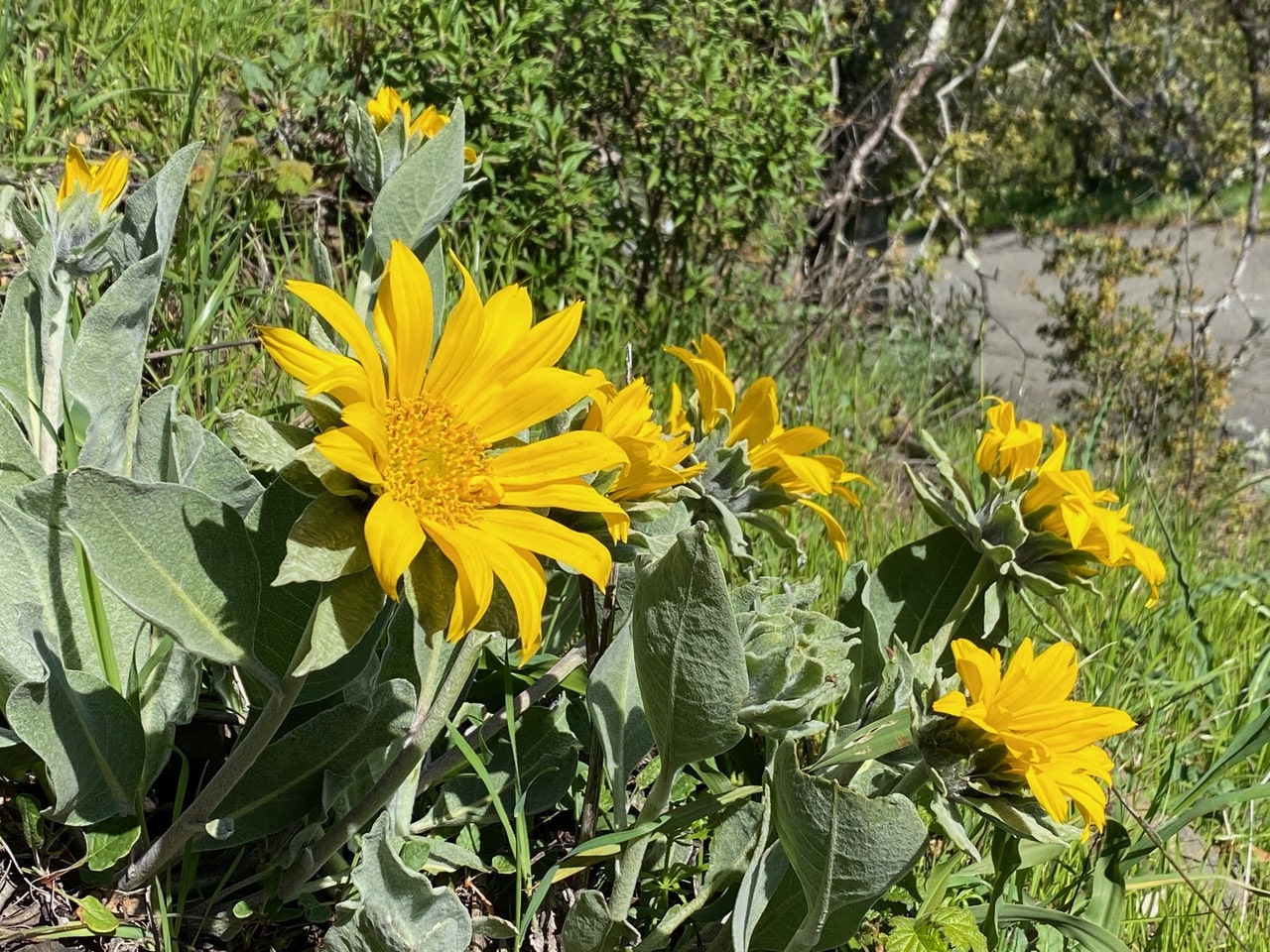 On the steep bank west of the road the Woolly Mule’s Ear, Wyethia helenioides is blooming gloriously. This species of the Asteraceae family occurs chiefly in the California Coast Ranges, and some areas of the Sierra Nevada foothills of California. It is a short, low-growing golden-rayed wildflower that resemble sunflowers. The tiny flowers on the flowerhead open from the rim towards the center as the flowerhead matures. There are still unopened buds in the middle of the flowerhead on the left.