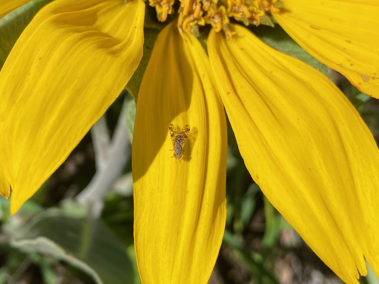I scramble up the slope to take a better look. There’s a familiar insect on one of the ray petals that I see regularly on the Mule’s Ear when the plant is in bloom – a fruit fly called the Sunflower Seed Maggot, Neotephritis finalis (family Tephritidae).