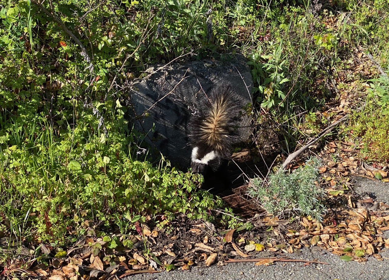 I am ready to cross the road to check on the blooming Oregon Grape when I notice some movements on the drain grate next to the plants. Its tail raised, a Stripe Skunk is scratching the ground to warn me. I quickly reroute. Lately I have encountered many skunk roadkills. The animals are actively moving around as it is their mating season (typically mid-February to mid-April). Give them a wide berth.