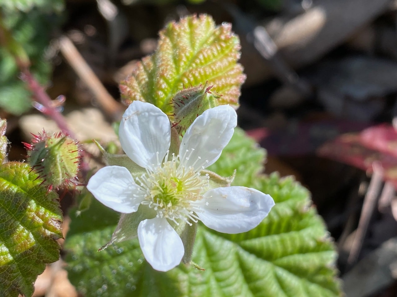A female California Blackberry, Rubus ursinus has started to bloom. The species is dioecious, with male and female flowers borne on separate plants. Female flowers (as shown here) have smaller petals and a central cluster of many pistils. Male flowers have larger petals and a central cluster of many stamens. It takes close examination to distinguish the sexes.