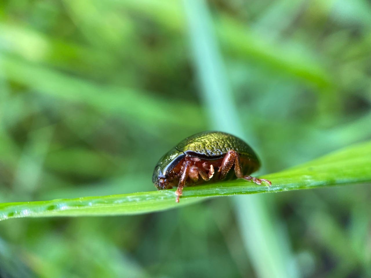 A large beetle with an iridescent green sheen is resting on a blade of grass. Its head is almost completely retracted under its thorax. It is a Leaf Beetle in the genus Chrysolina (family Chrysomelidae).