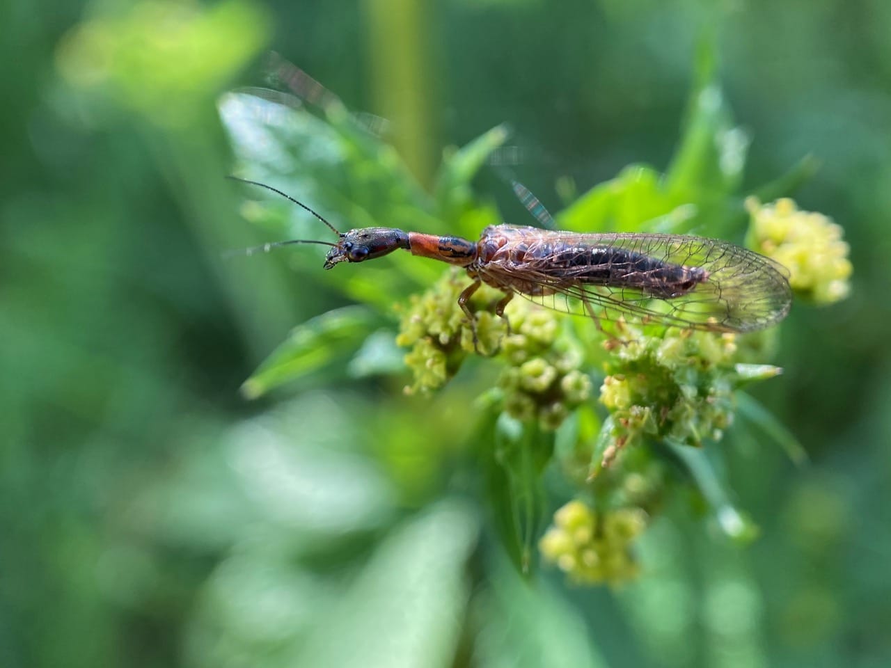 Snakeflies are a group of predatory insects comprising the order Raphidioptera. They are a relict group, having reached their apex of diversity during the Cretaceous before undergoing substantial decline. Adult Snakefly has a notably elongated thorax which, together with the mobile head, gives the group their common name of snakefly. The body is long and slender and the two pairs of long membranous wings are prominently veined. The head is long and flattened and heavily sclerotized. The mouthparts are strong and relatively unspecialized, being modified for biting. The large compound eyes are at the sides of the head. Females have a large and sturdy ovipositor which is used to deposit eggs into crevices or under bark. Snakeflies are holometabolous insects with four-stage life cycle consisting of eggs, larvae, pupae and adults. Both adults and larvae are predators of soft-bodied arthropods such as aphids and mites.