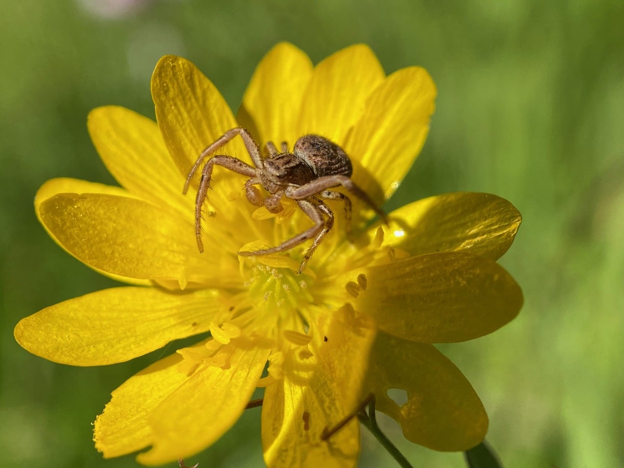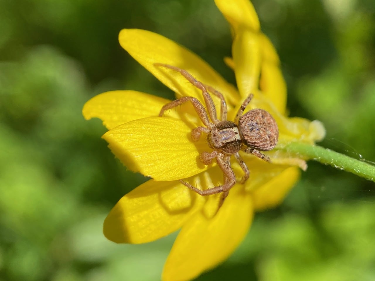 Just steps away, I spot this Common Crab Spider, Xysticus cristatus (family Thomisidae) on a buttercup flower. It is obviously a male, holding his boxing-glove-like pedipalps below his face.