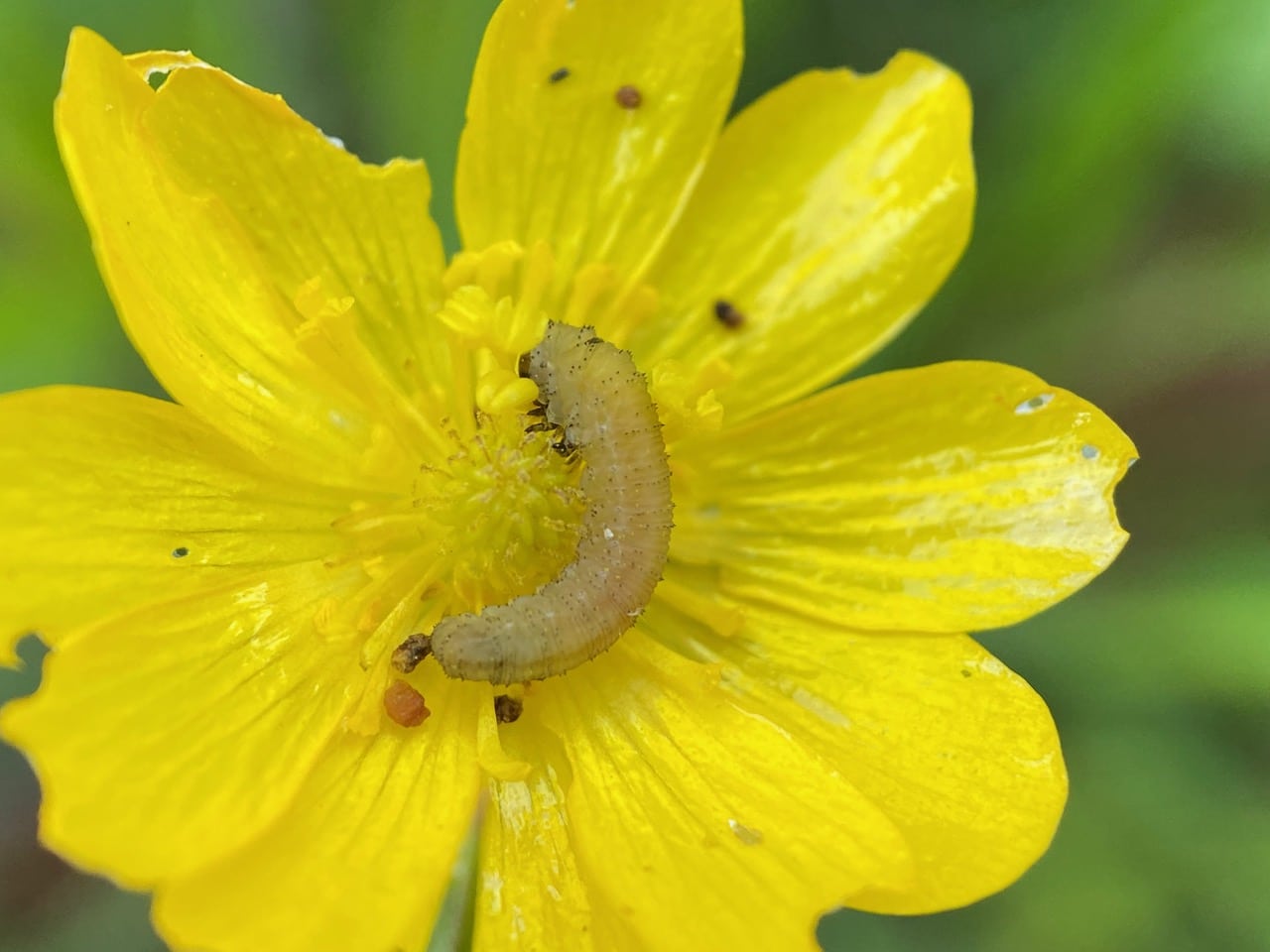 Ooh, a caterpillar feeding openly on a buttercup flower! I wonder how long a juicy caterpillar can survive in a world rife with predators and parasites.