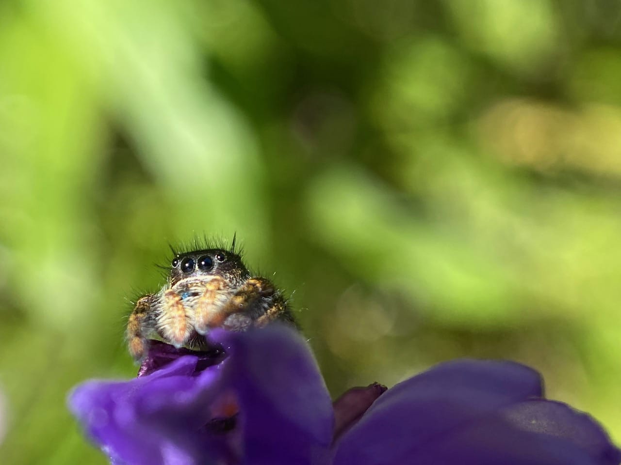Jumping spiders have excellent vision, with among the highest acuities in invertebrates. The 8 eyes are grouped four on the face (the two big Anterior Median Eyes in the middle, and two smaller Anterior Lateral eyes to the side), and four on top of the carapace. The anterior median eyes provide high acuity but small field of view, while the other six eyes act like our peripheral vision, with lower resolution but broad field of view. Since all eight eyes are fixed in place and can’t pivot independently from the body like human eyes can, jumping spiders must turn to face whatever they want to see well. This includes moving their cephalothorax up and down, an endearing behavior.