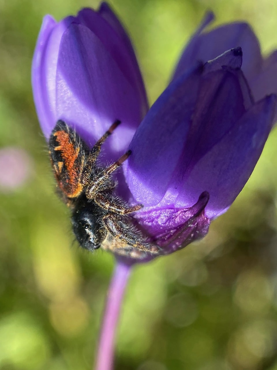 A Red-backed Jumping Spider, Phidippus johnsoni (family Salticidae) is hunting on a Blue Dicks flower cluster.