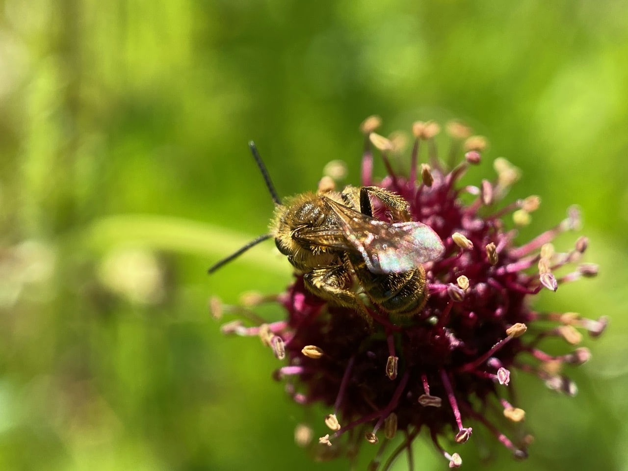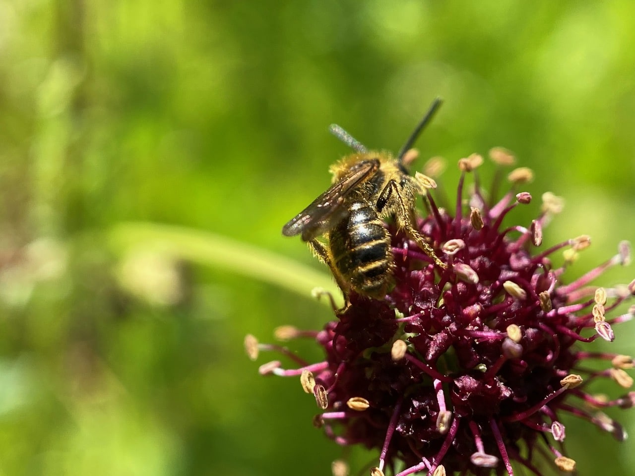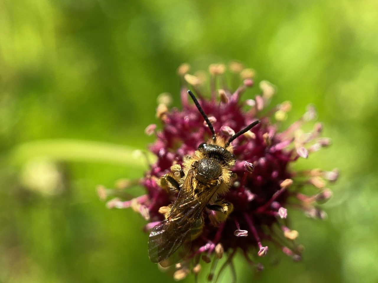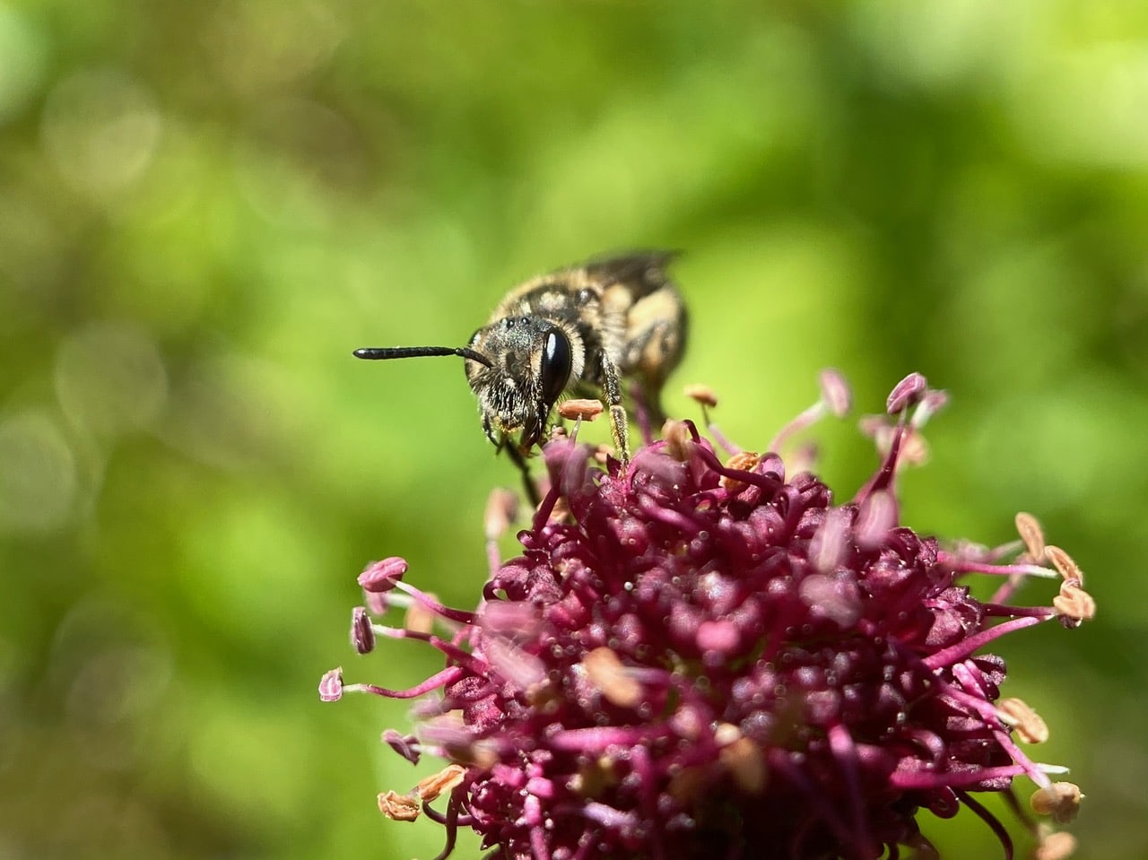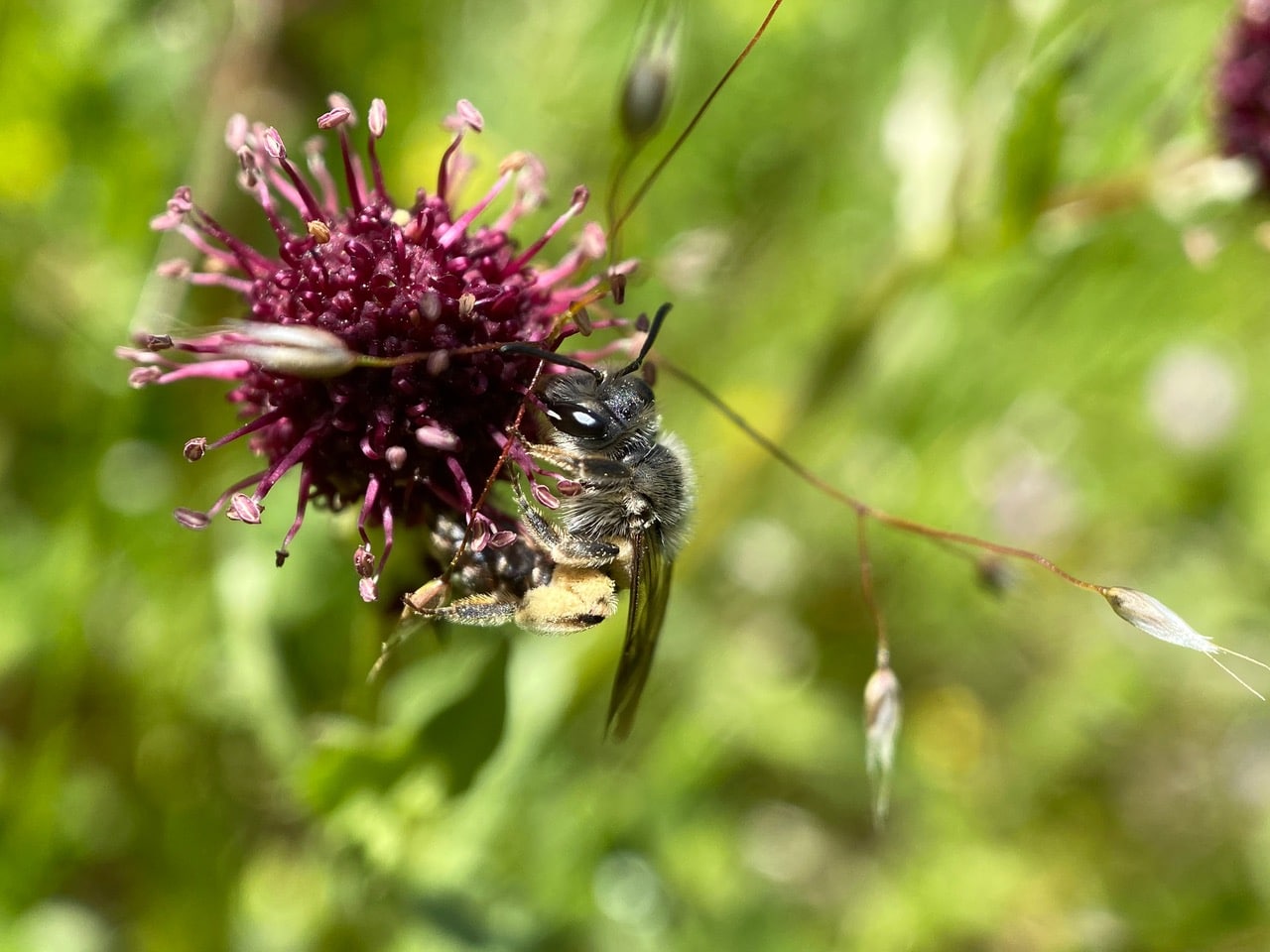 A female bee is foraging on a Purple Sanicle flowerhead. She already has a pretty full load of pollen on her hindlegs, and also in her “arm pit”, the area between the thorax and abdomen called the propodeum.