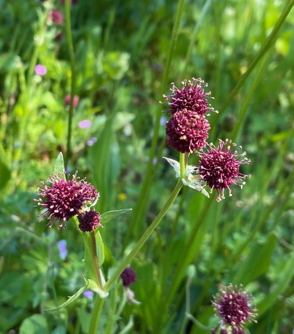 The Purple Sanicle, Sanicula bipinnatifida (family Apiaceae) is in peak bloom. Although small, the globular, reddish-purple flowerheads are eye-catching among the low undergrowths. Native to the West Coast from British Columbia to Baja California, the perennial is found in various habitats, including grasslands, meadows, chaparral, woodlands and pine forests.