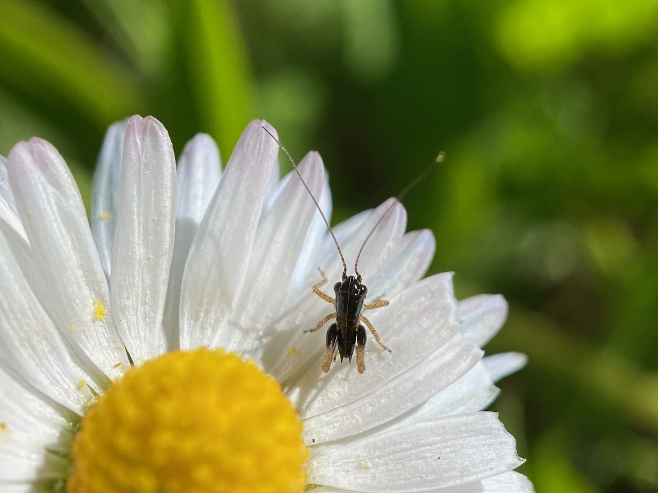 Putting on the macro lens to look at a black spot on the disc flowers of an English Daisy, I almost can’t believe my eyes – the tiny thing is the smallest baby cricket I have ever seen! Most other Orthopteran nymphs I have encountered were green.
