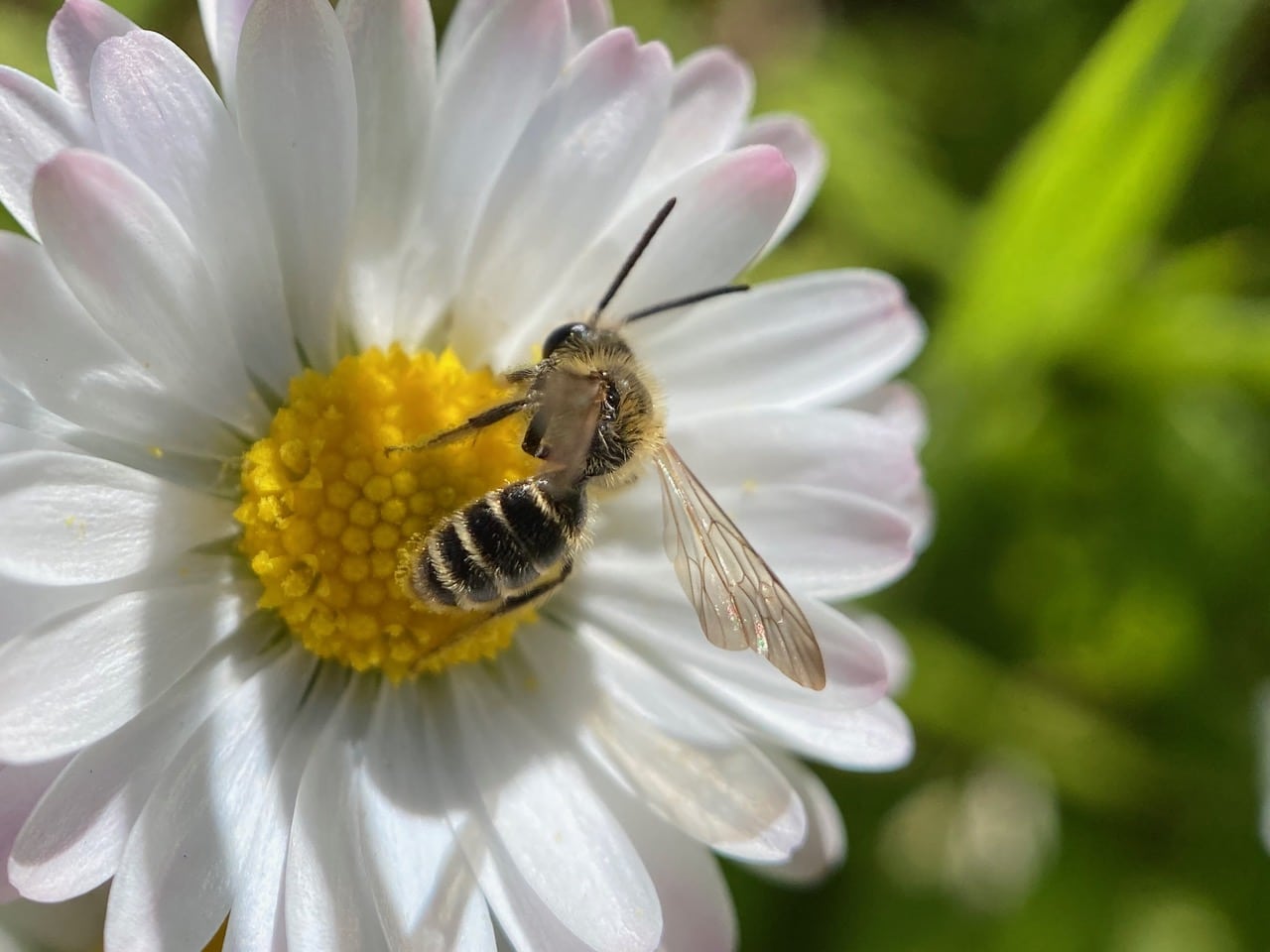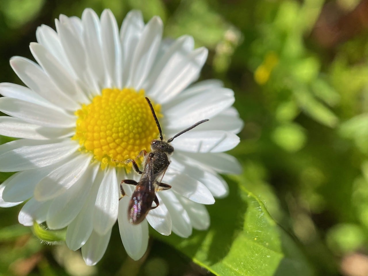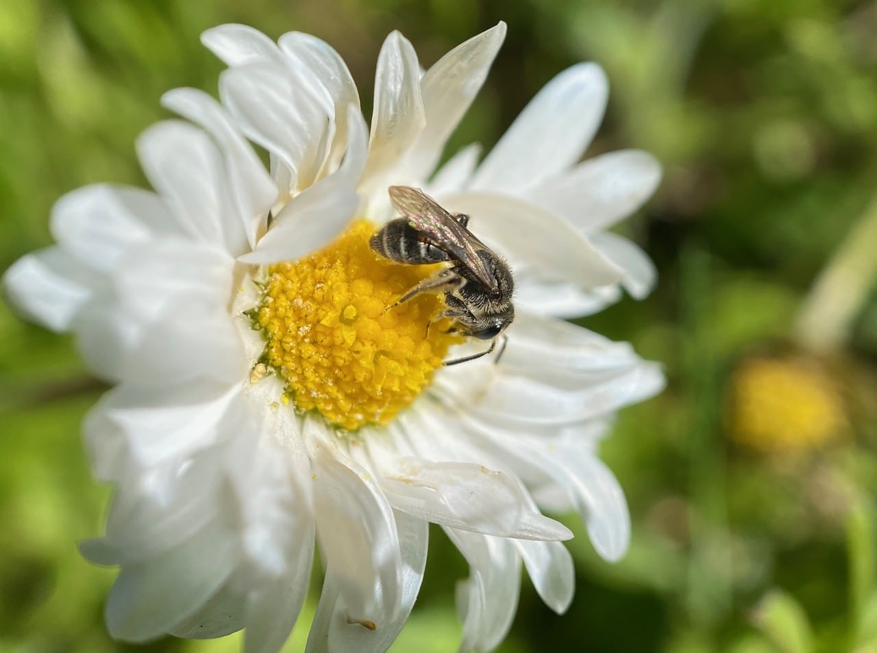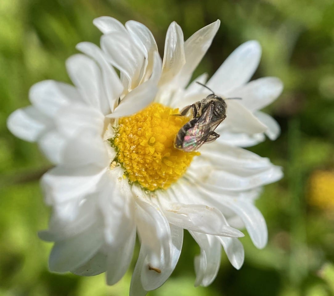 Back at the Padre picnic area, I see many insects visiting the English Daisies on the lawn around the picnic table.