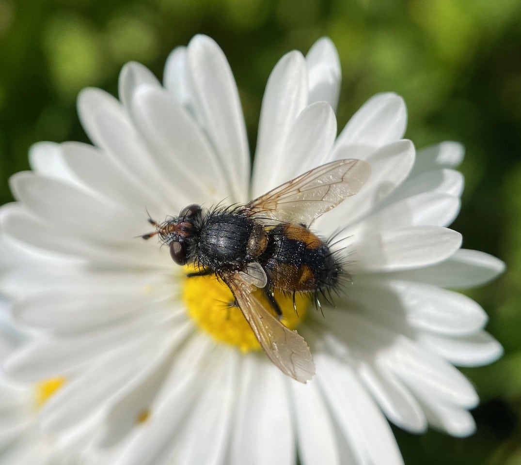 A ragged Bristle Fly (family Tachinidae) flits from one English Daisy flower to the next in search of sustenance.