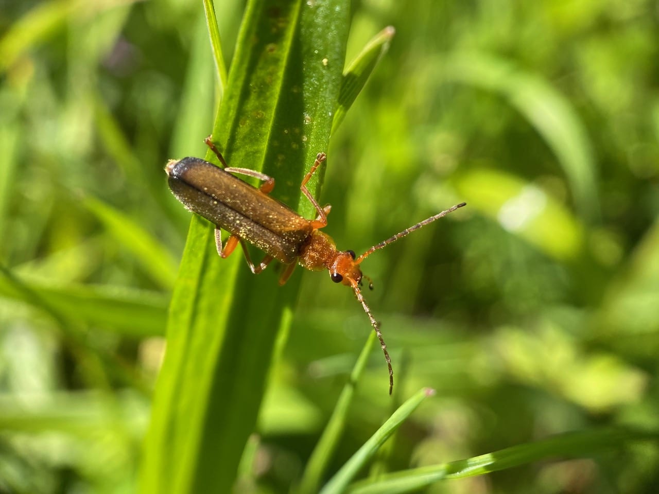 A Soldier Beetle is foraging in the undergrowth.