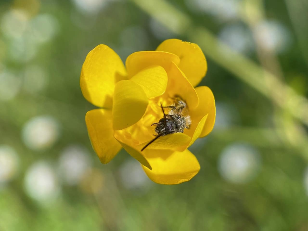 It is a scruffy male buttercup-loving Andrena getting ready for the night! This reminds me of my first encounter with this phenomenon – of a male asleep on a buttercup flower on 3/21. That opened up a new world of the Mining Bees for me, sending me on a joyous journey following their progress through the season. Since the species seems to be monolectic, depending solely on the buttercups, their season will be short. I cherish every day that these bees and their beloved flowers are around.
