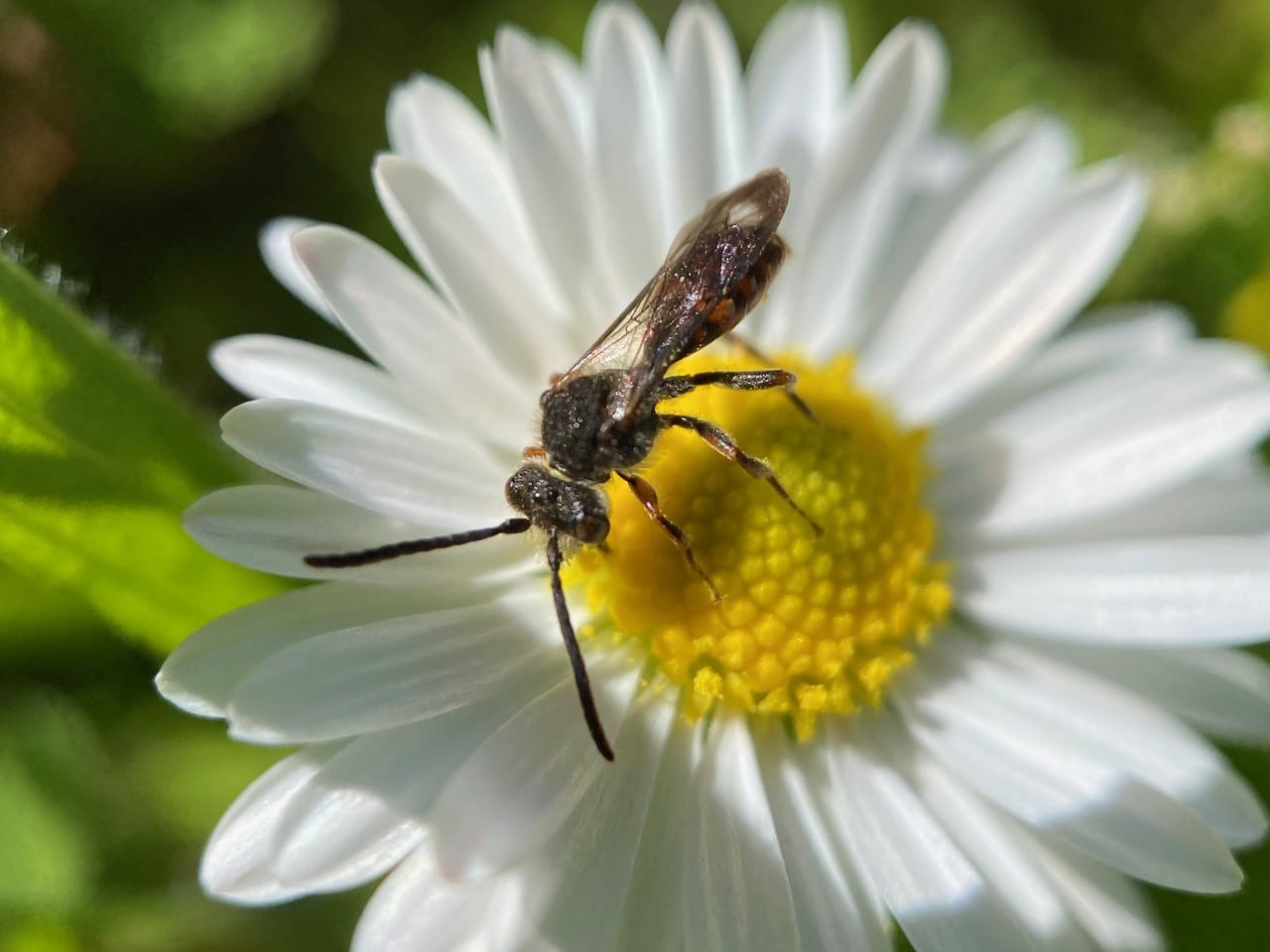 Because of the way this little bee tends to hold its wings up like a wasp as it feeds, it has me running after it for a better look. Turns out it’s not a wasp after all, but a bee, most likely a Mining Bee (family Andrenidae).