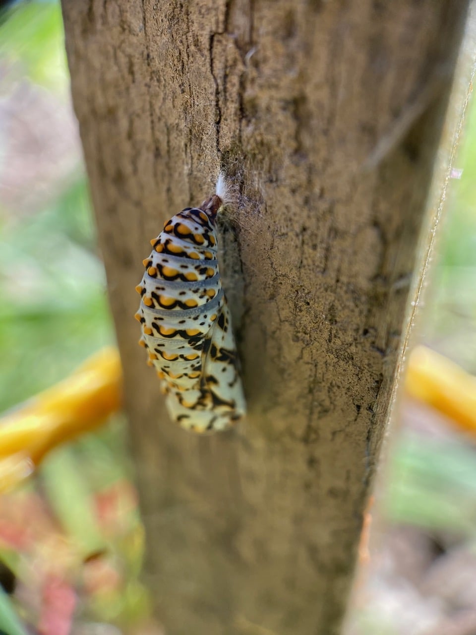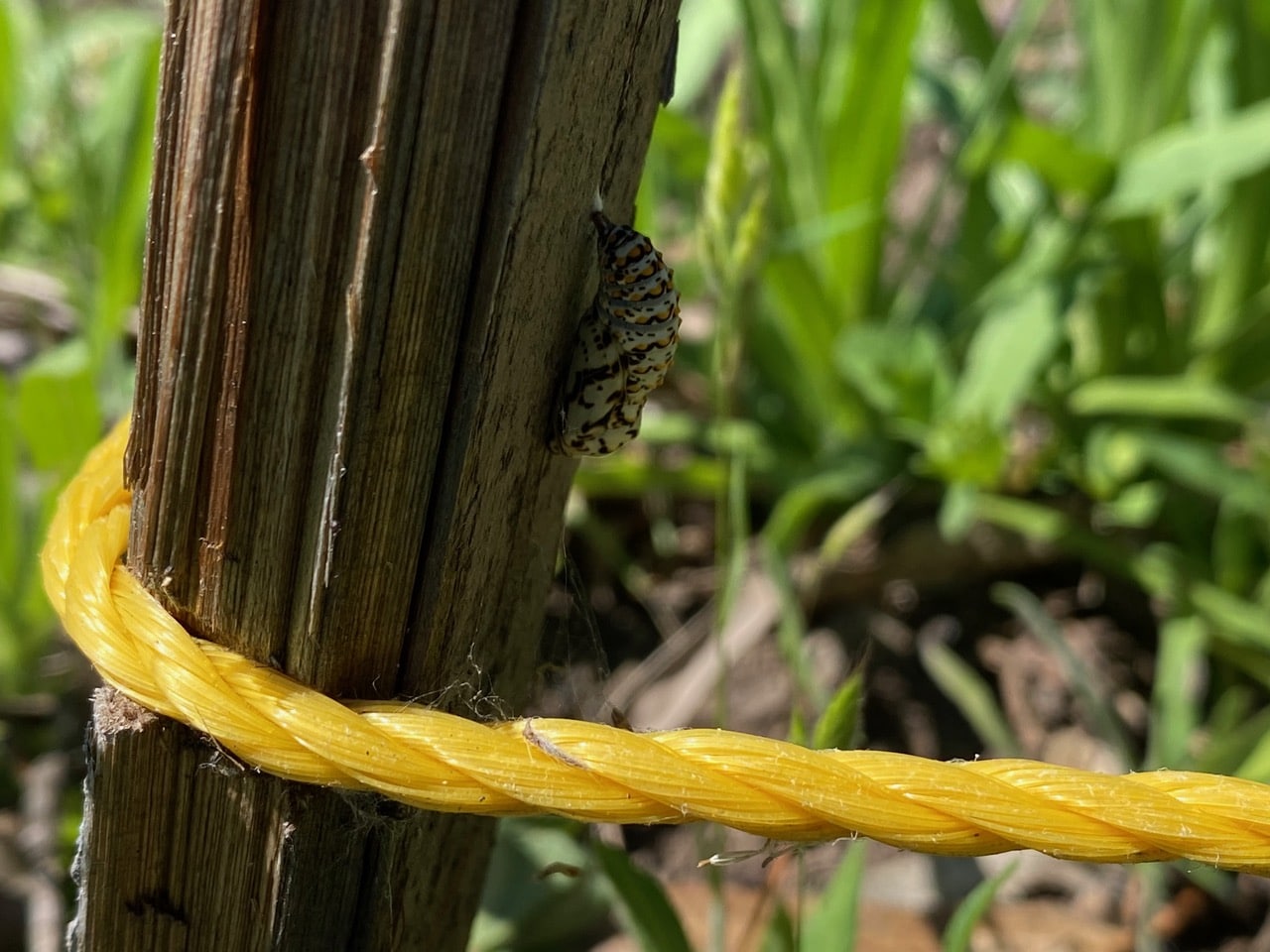 While photographing the spider, I spot a chrysalis attached to one of the wooden pegs that hold the yellow rope around the flowerbed.