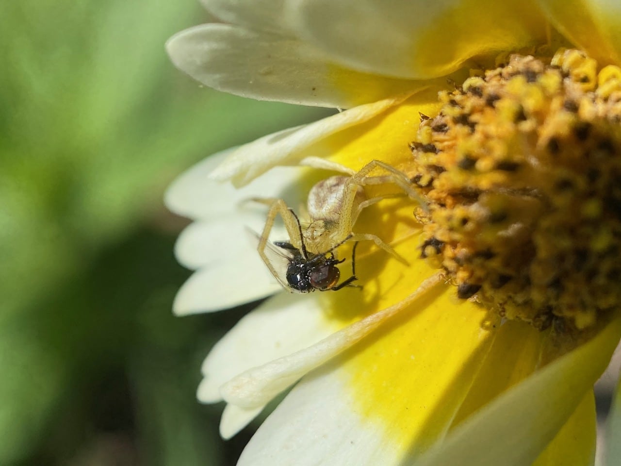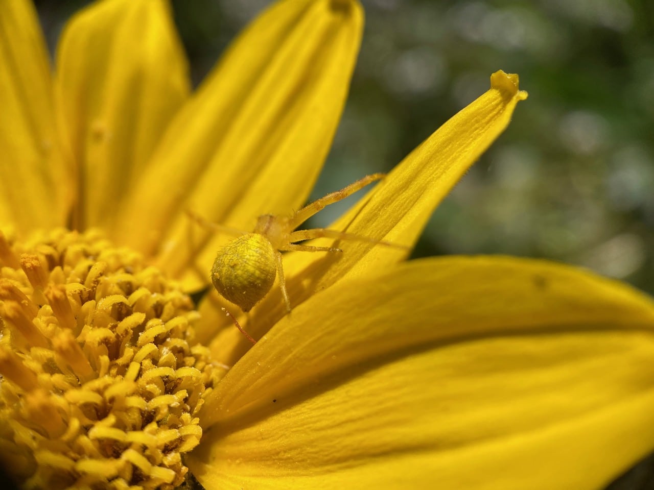 Whoa! I almost didn’t see this incredibly well-camouflaged Crab Spider sitting in ambush on a ray flower of the Mt. Diablo Helianthella.