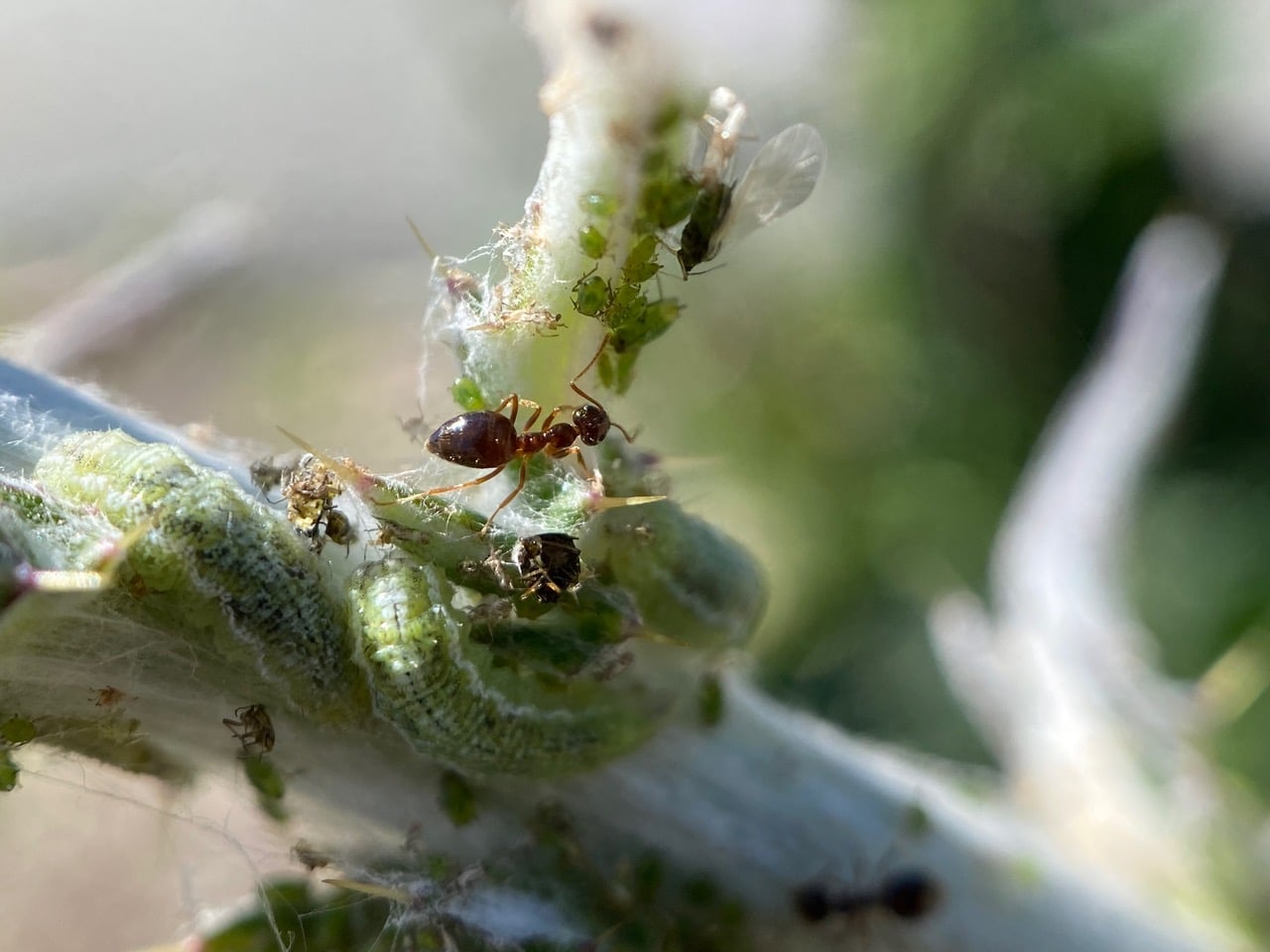 Ants and aphids share a well-known mutualistic relationship. The aphids produce honeydew, a sugary food for the ants; in exchange, the ants care for and protect the aphids from predators and parasites. Some ants will “milk” the aphids to make them excrete the sugary substance. The ants stroke the aphids with their antennae, stimulating them to release the honeydew. Aphid-herding ants make sure the aphids are well-fed and safe. When the host plant is depleted of nutrients, the ants carry their aphids to a new food source. If predatory insects or parasites attempt to harm the aphids, the ants will defend them aggressively. Some species of ants continue to care for aphids during winter. The ants carry the aphids to their nest for the winter months, and transport them to a host plant to feed the following spring.