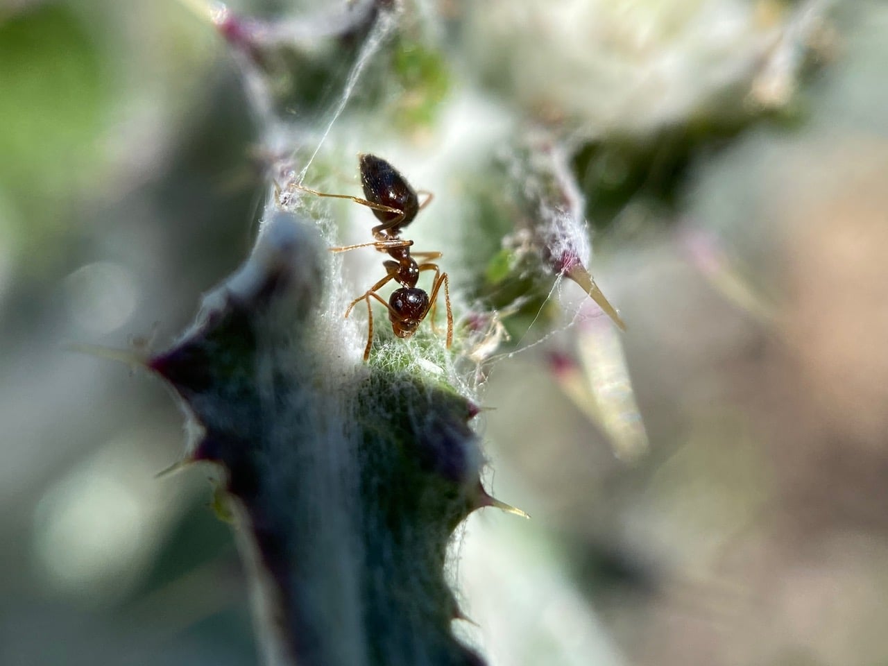 On this immature thistle flowerhead, I watch in amusement as the ant taps the young aphids with its antennae to stimulate them to secrete honeydew.