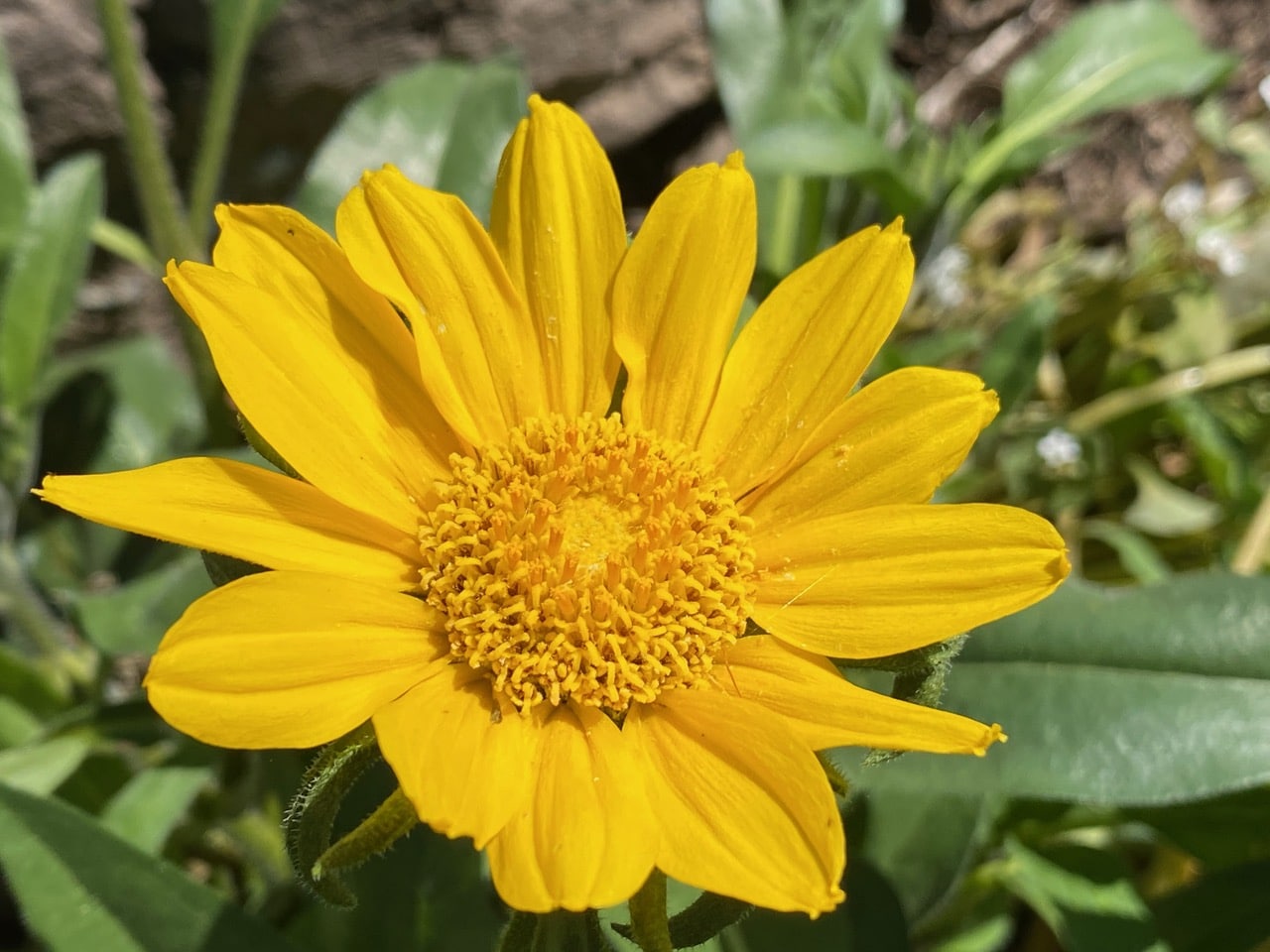 On first glance, the flowers of Mt. Diablo Helianthella resembles those of Mule’s Ears, Wyethia sp. The Diablo Helianthella is distinguished from mule ears chiefly by having sterile ray flowers, a characteristic not readily recognizable to the casual observer. Note the ray flowers on the rim of this flowerhead (those with petal-like structures) – there are no female reproductive parts protruding. These ray flowers are sterile and will not produce any seeds.