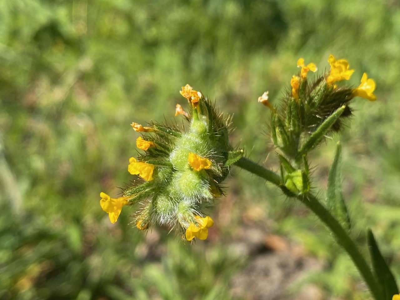 The green swellings on this inflorescence of Common Fiddleneck, Amsinckia intermedia are flower galls induced by the Fiddleneck Gall Nematode, Anguina amsinckia. The nematode causes the plant to form floral galls that replace the flowers. Apparently about 40,000 nematodes occur in an average 3/8” diameter gall! The nematode has been proposed as a biological control of weedy Amsinckia that grow in crop fields.