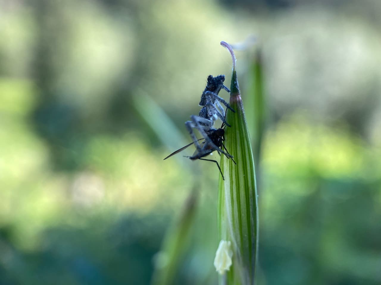 On a short morning walk up the hill from Siesta Gate, I spot something dark on a grass seed dangling from an arching stalk. A spider has caught a Dance Fly!