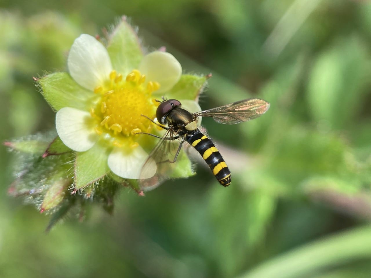 A Diamond Spottail, Fazia micrura (family Syrphidae) forages on a flower of Sticky Cinquefoil, Drymocallis glandulosa. The species is easily identified by the four diamond-shaped yellow markings near the tip of the abdomen.