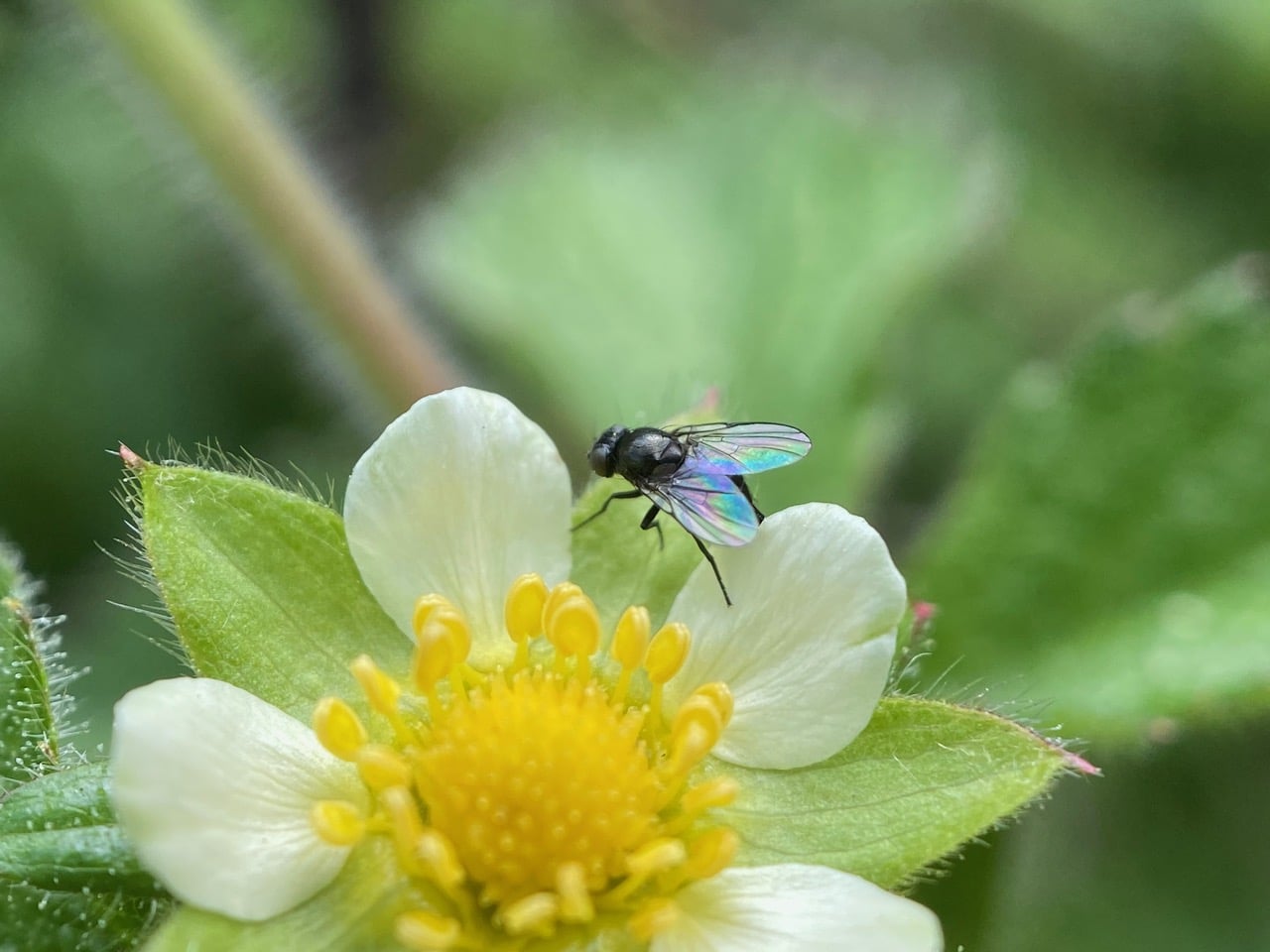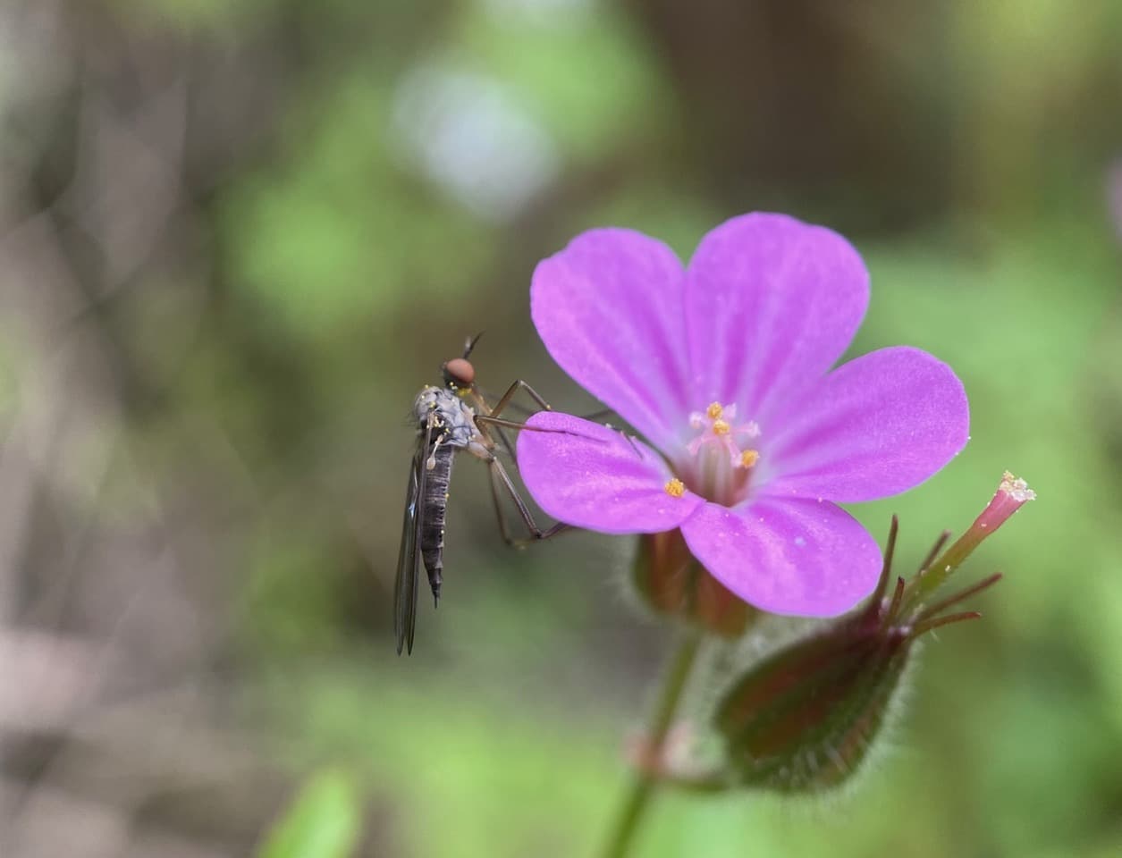 An Empidid Dance Fly (family Empididae) has just taken nectar from a Wild Geranium flower, and has some pollen stuck to its body.