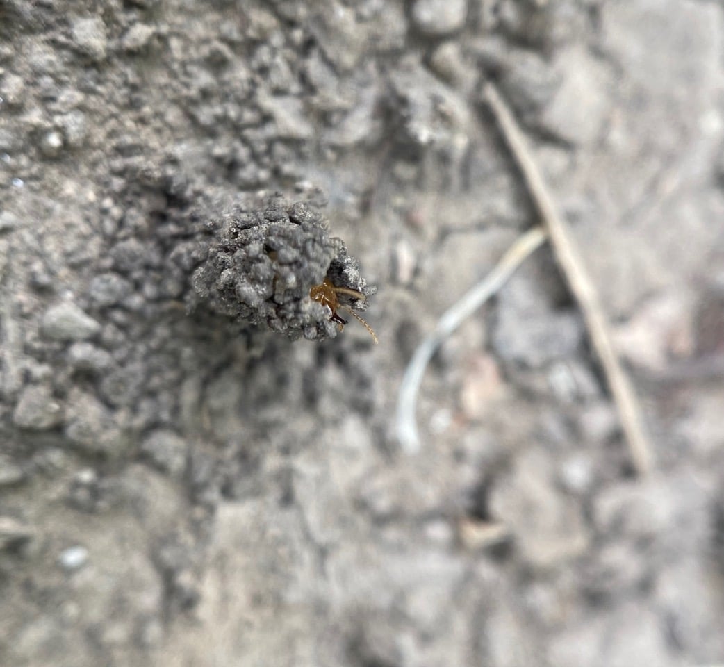 A plug of compacted soil is raised about 7 mm above the bare ground like a miniature chimney. In the central opening, I spy movements of a pair of antennae, and occasionally a head and mandibles. Termites!