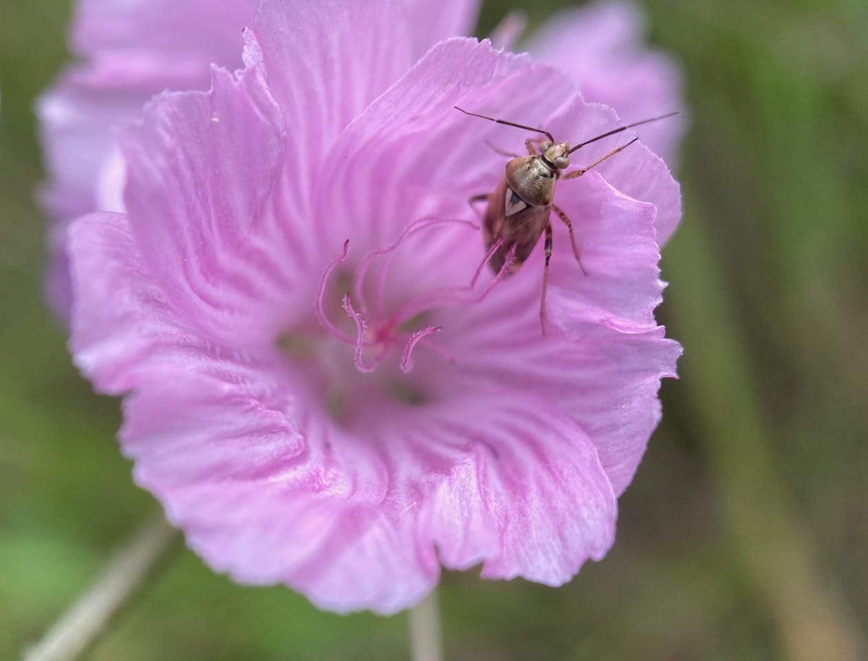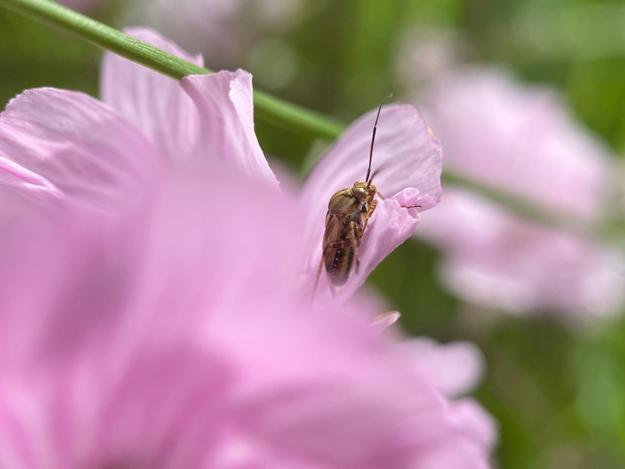 A Western Tarnished Plant Bug, Lygus hesperus (family Miridae) scrambles out of an older Checkerbloom flower.