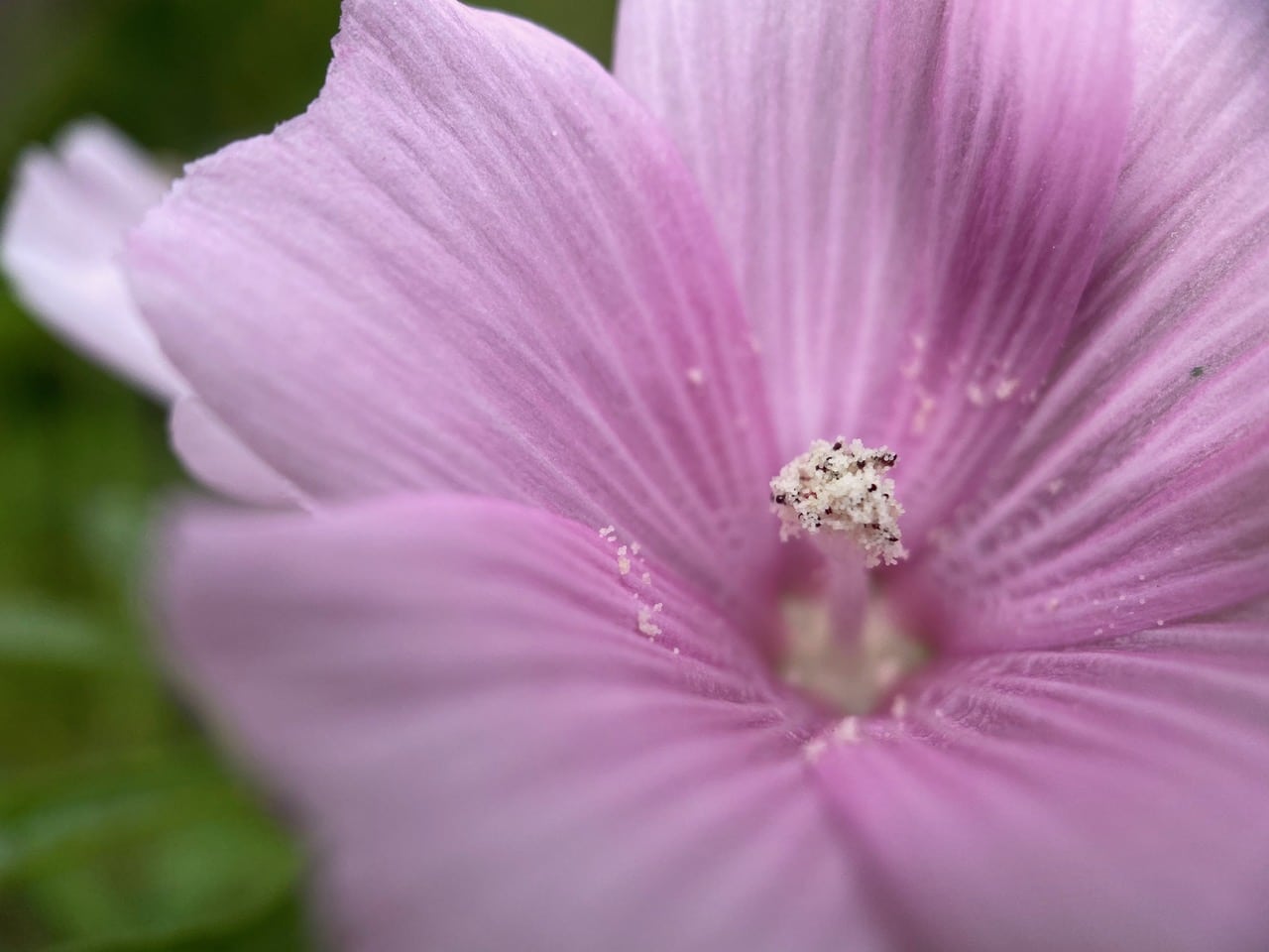 The flowers of Checkerbloom are protandrous, the male parts maturing before the female parts. In the male phase, white pollen is released from the stamens that are fused into a single column in the middle of the corolla.