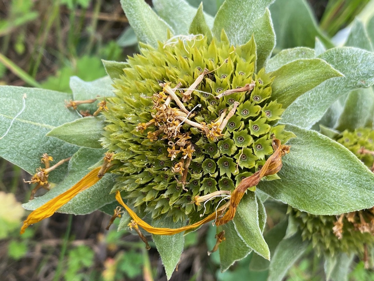 The large flowerheads are setting seeds after the flower parts are shed.