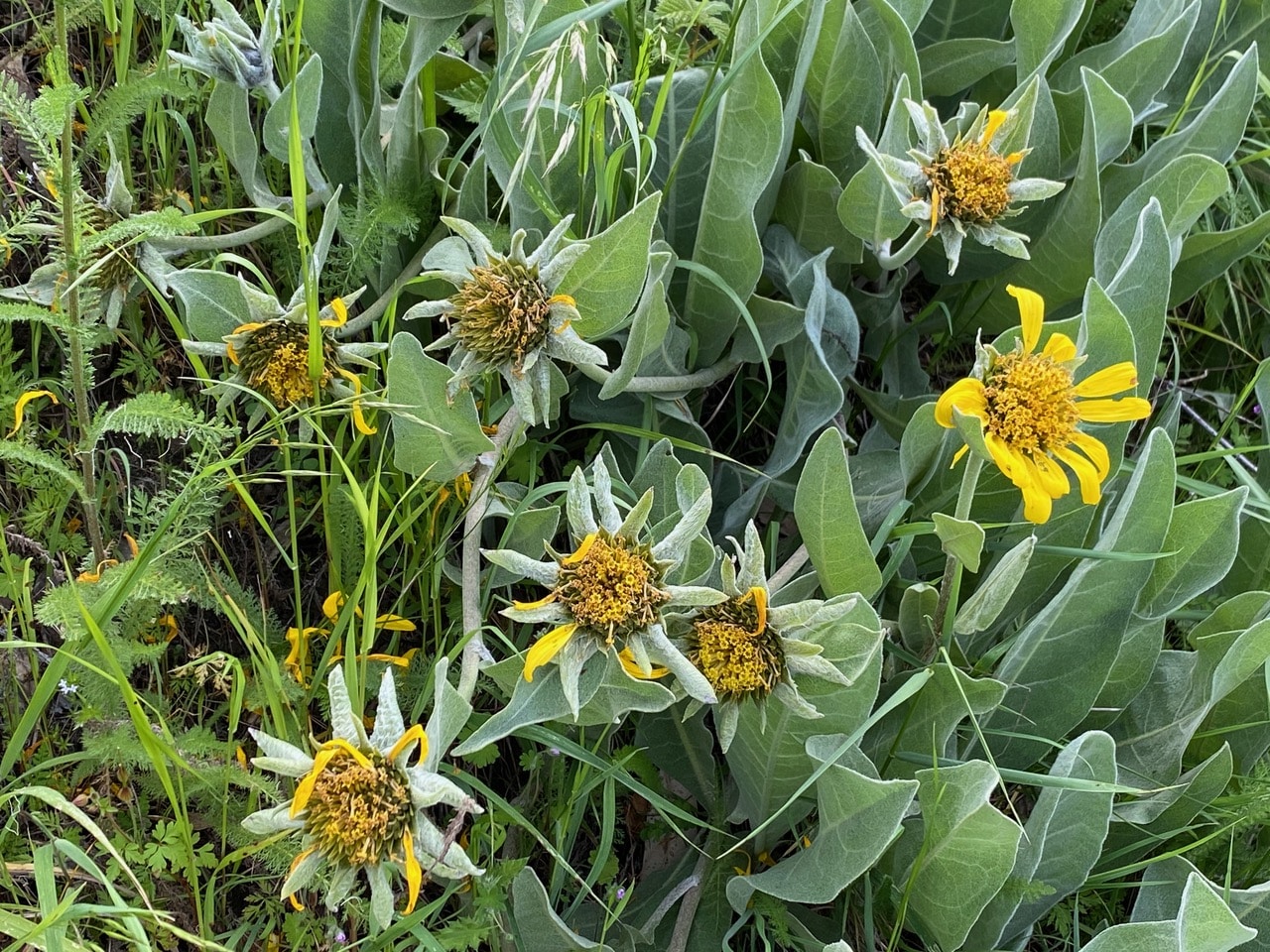 The season is progressing rapidly for the Woolly Mule’s Ear, Wyethia helenioides on the grassy hillside along Skyline Trail. All the flowers have faded. Even the Sunflower Seed Maggot Flies are nowhere to be seen.
