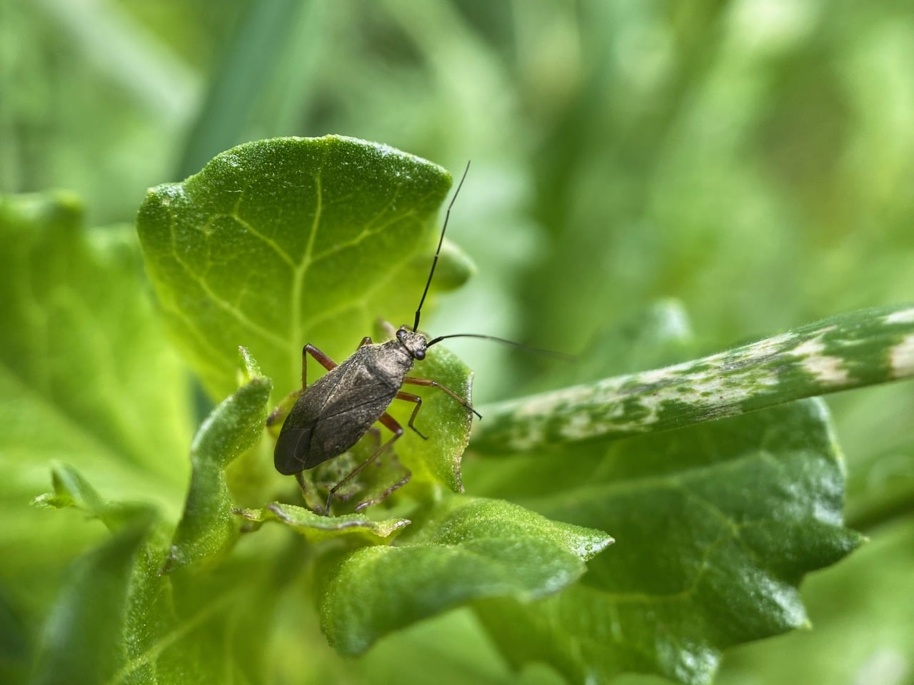 Hah, I found the culprit – a Black Grass Bug, Irbisia sp.(family Miridae) perched on a Coyote Brush next to the damages grass.