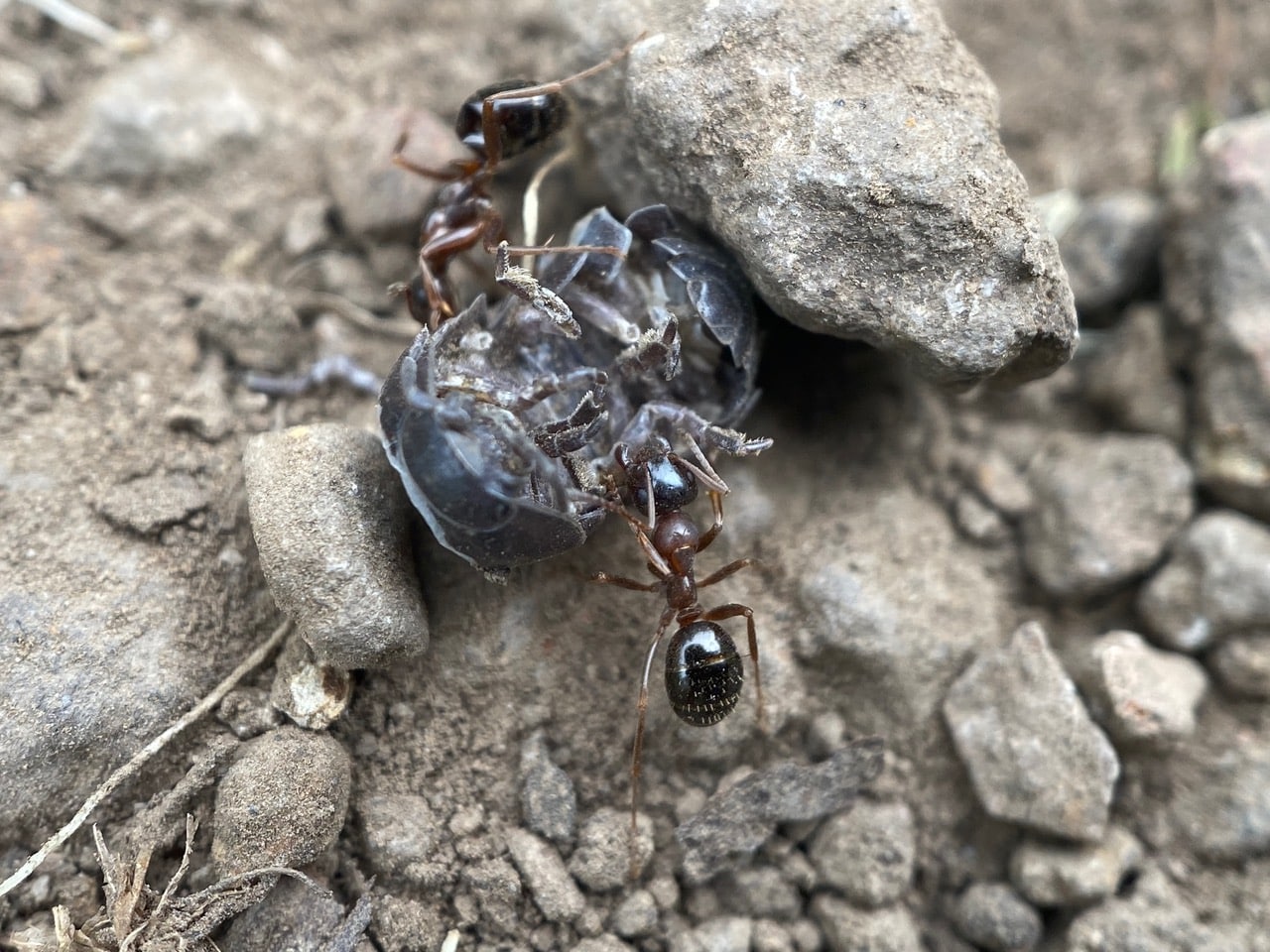 In the middle of the trail, two Field Ants, Formica subpolita (family Formicidae) are trying to move a dead Pill Bug on the ground.