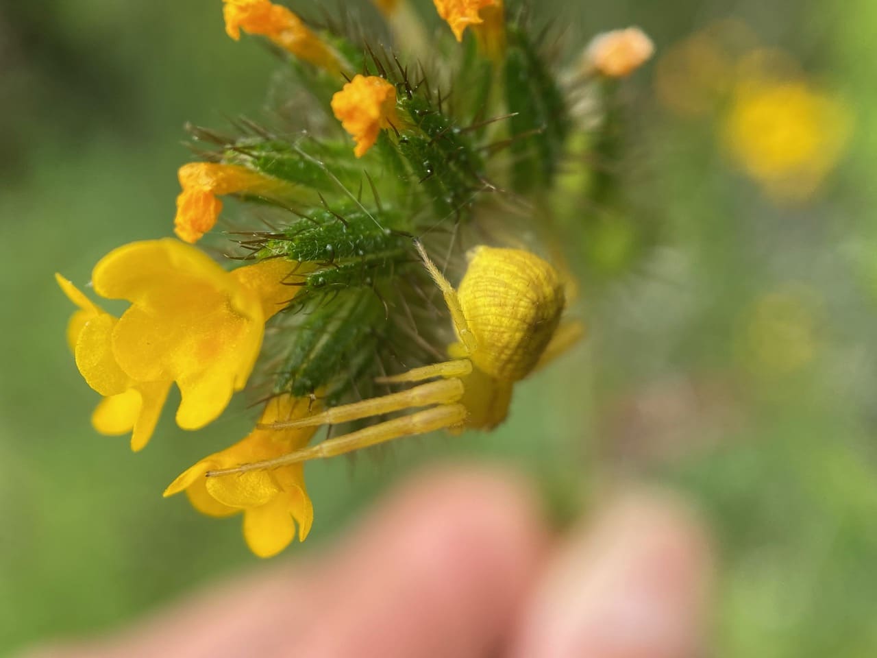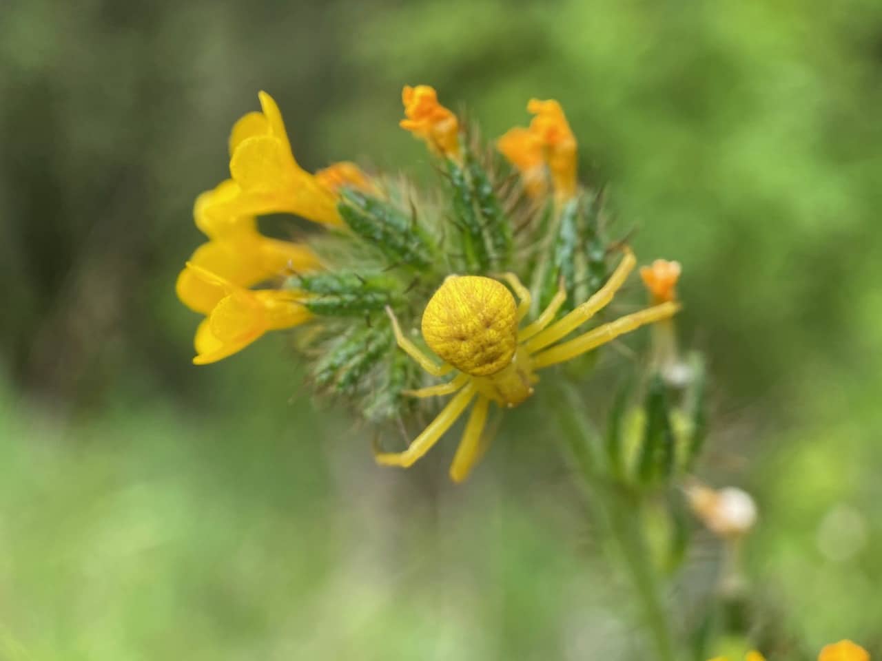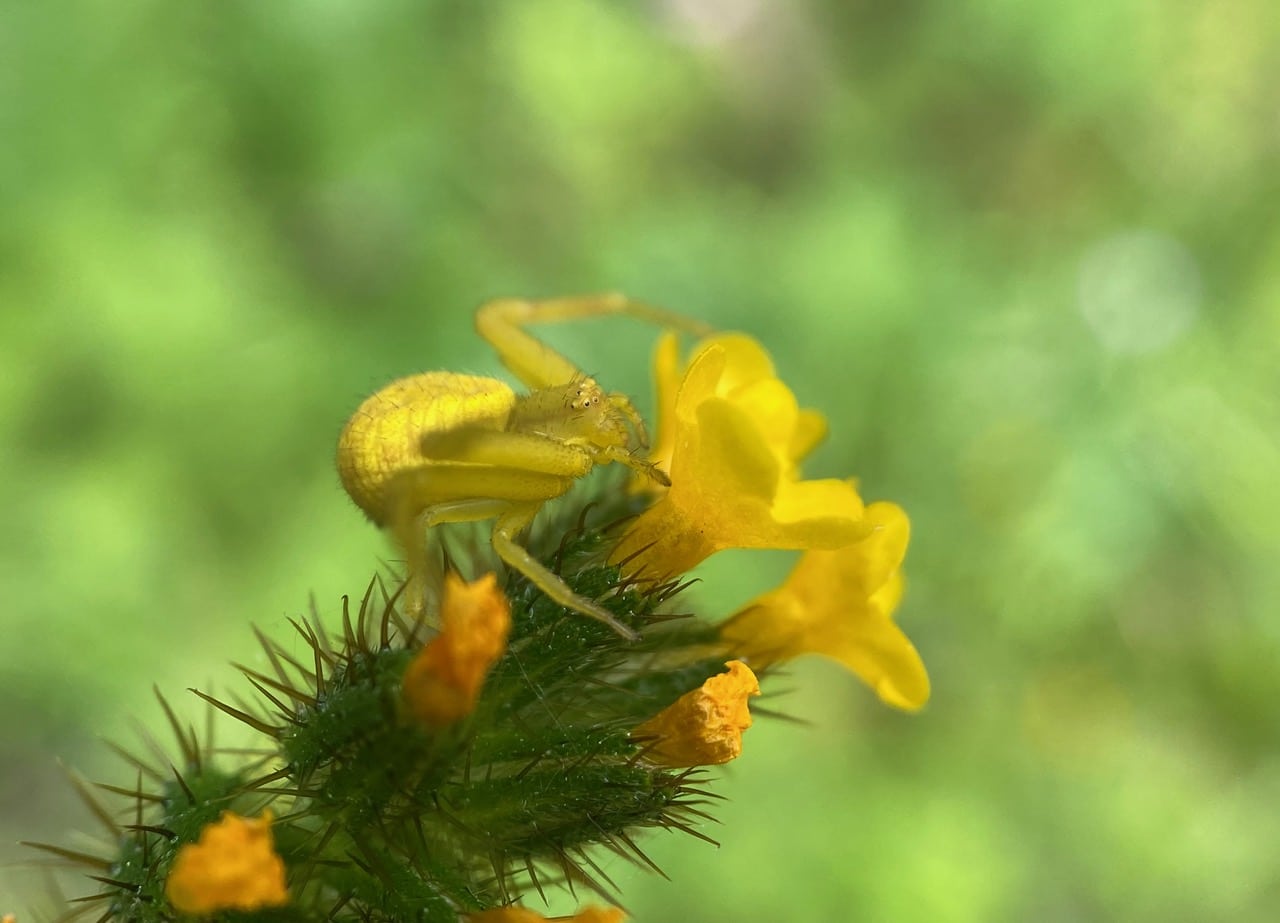 Ooh, there’s a yellow Crab Spider (family Thomisidae) on an inflorescence of the Common Fiddleneck, Amsinckia intermedia.