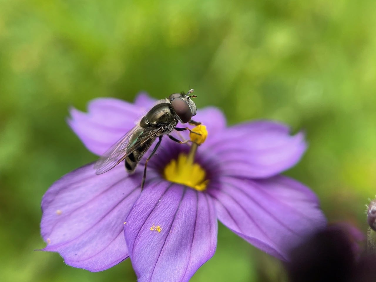 A Sedgesitter, Platycheirus sp. (family Syrphidae) is feeding on pollen of a Blue-eyed Grass flower.