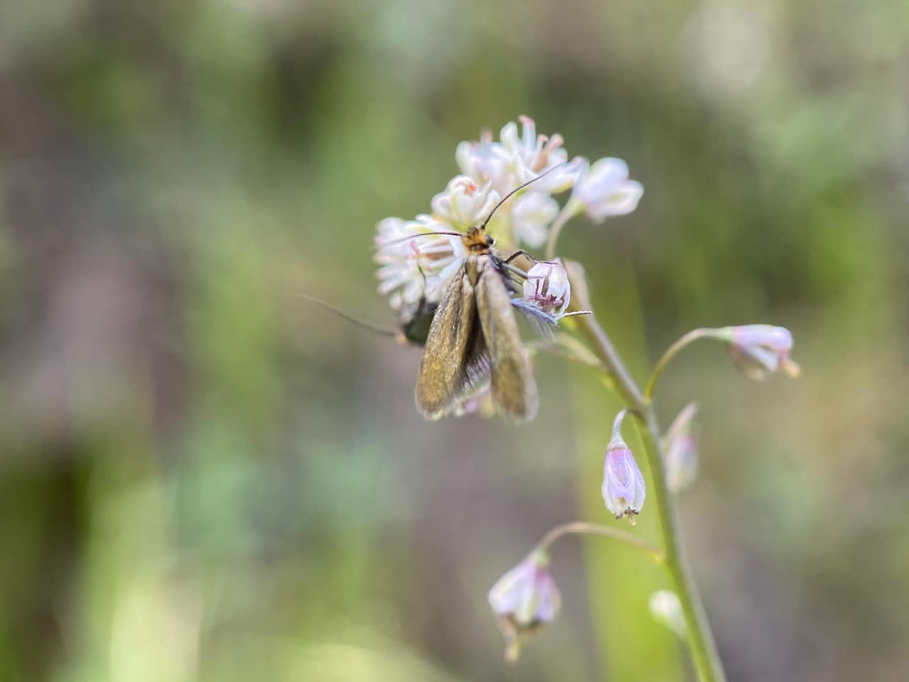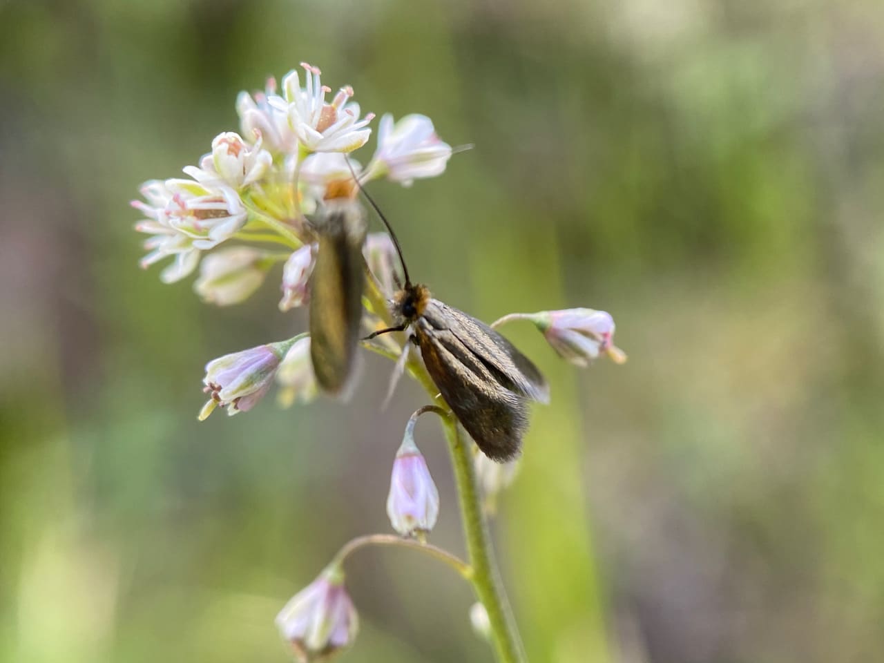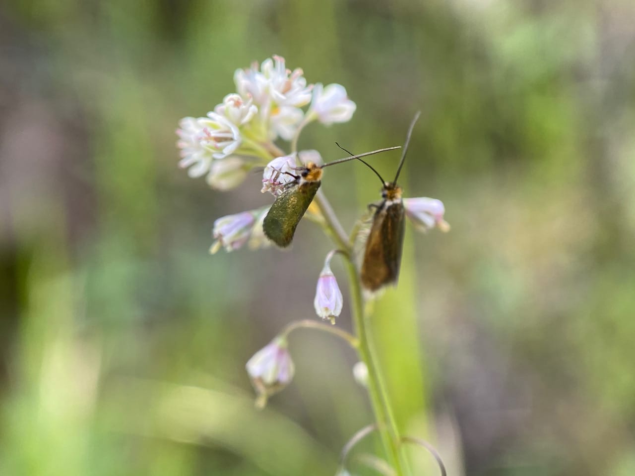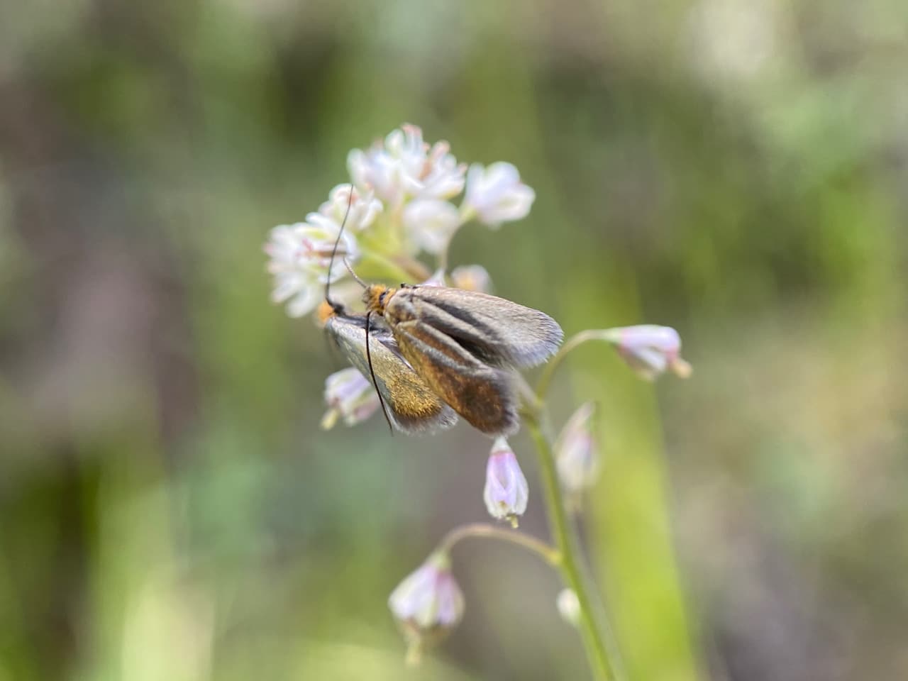 The Adelidae or Fairy Longhorn Moths are a family of small diurnal moths, with wingspans of 4-28 mm, and males often have especially long antennae, 1-3 times as long as the forewing. Many species are known for their lekking behavior, where males gather to display competitively for the females for the right to mate. During lekking events, males would swarm around the tips of branches with an undulating flight, their white antennae conspicuously visible. Adelidae are usually closely restricted to specific host plants. The females insert their eggs in the plant or just oviposit among leaf litter, and the caterpillars make a case, completing their development on the ground. Fairy Longhorn Moths feed in sunshine on nectar from the flowers of herbaceous plants.