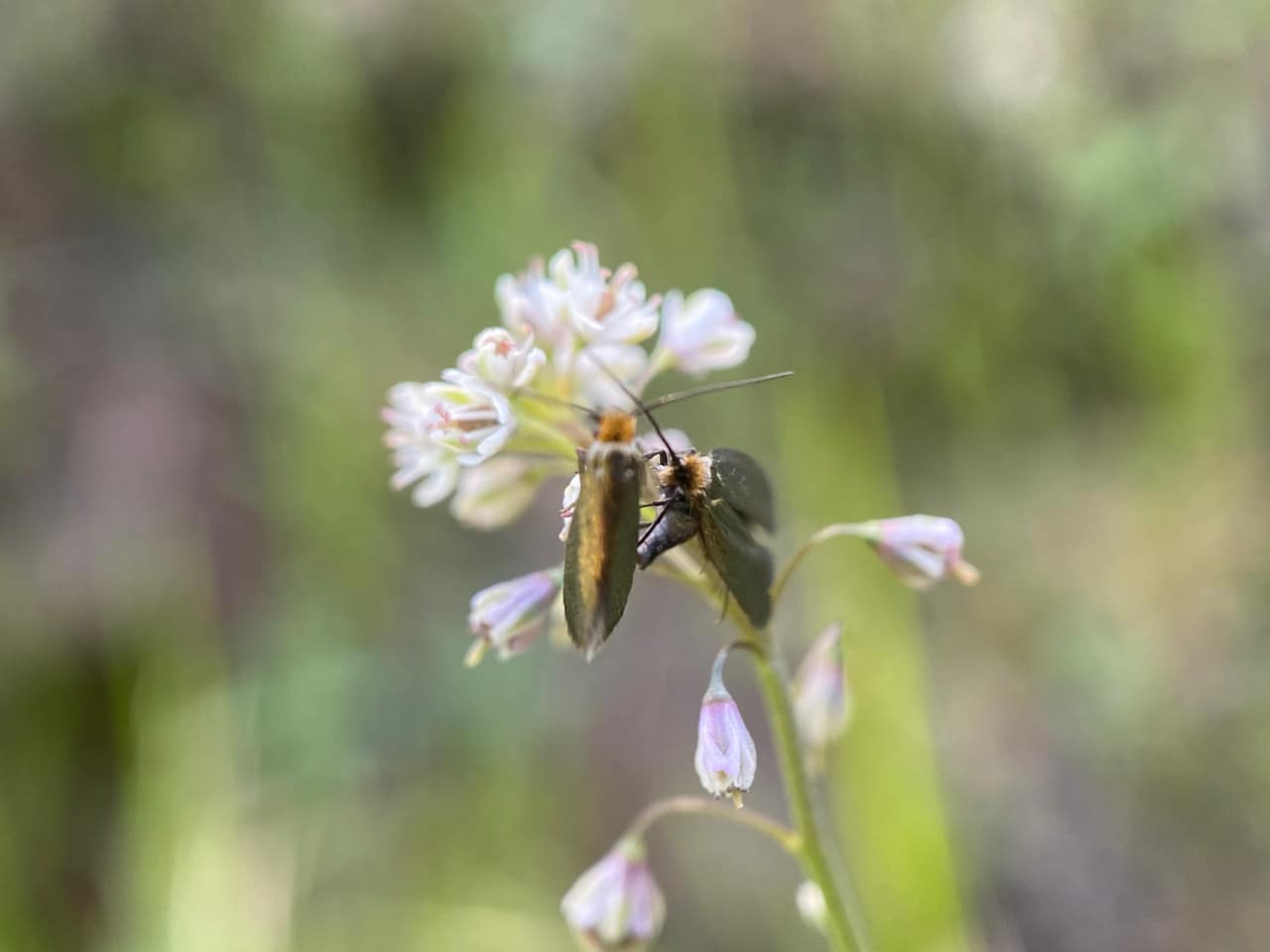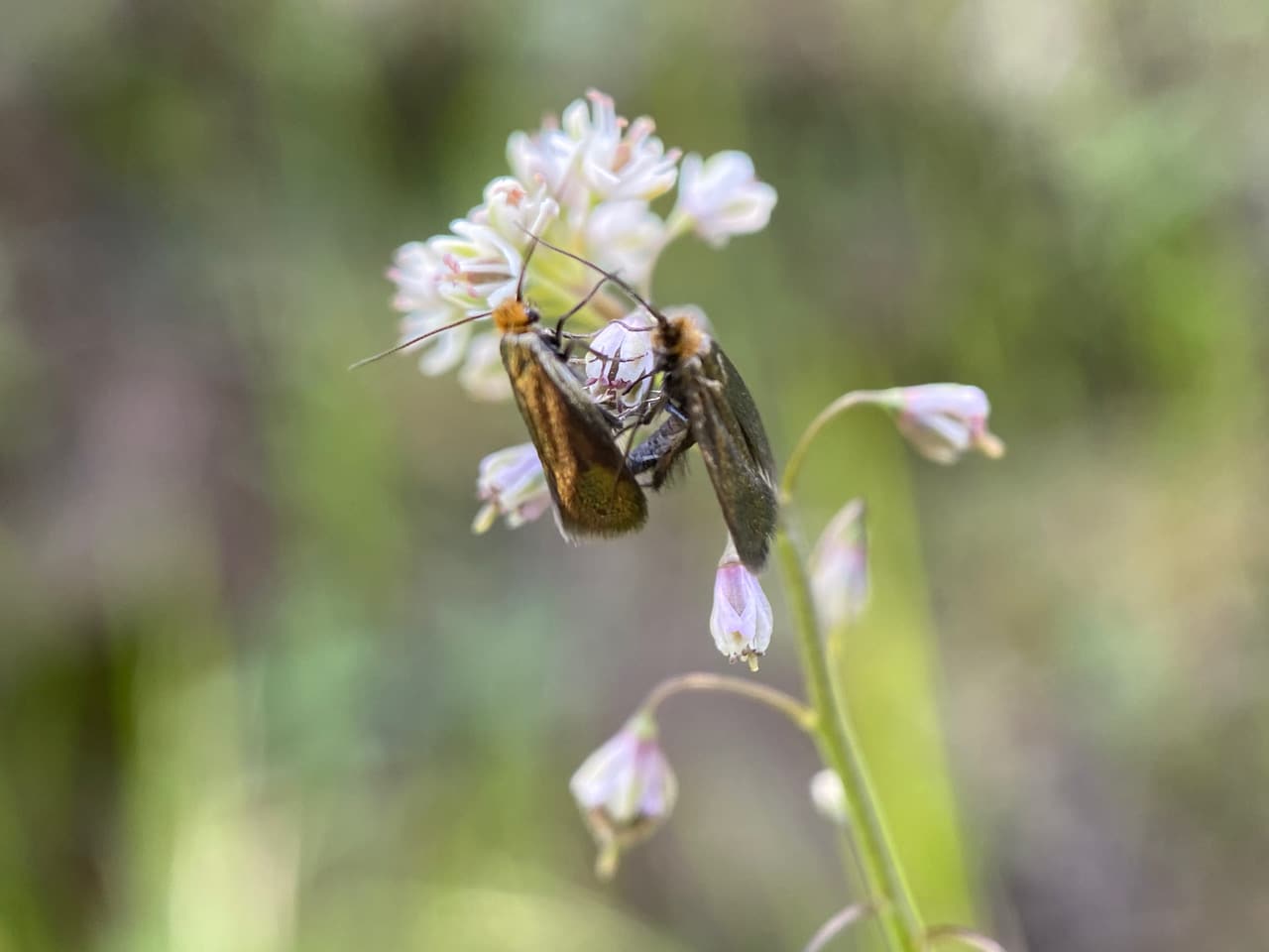 Scanning the Fringe Pods, Thysanocarpus curvipes (family Brassicaceae) on the banks along Skyline Trail, I spot these two Fairy Longhorn Moths, Cauchas simpliciella (family Adelidae) perched on the same plant. Are they going to interact with each other?