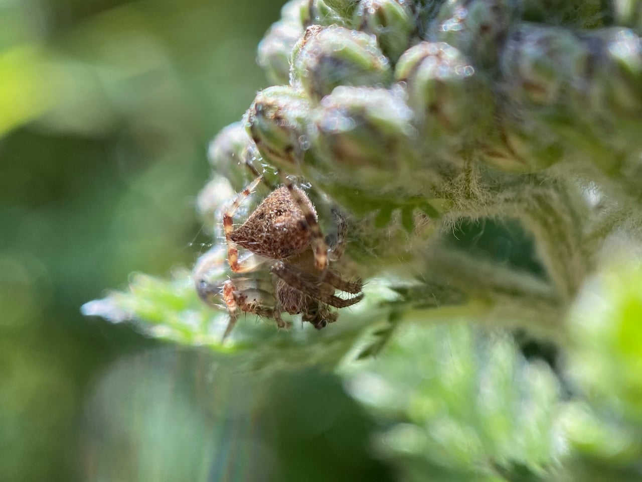 A Typical Orbweaver Spider is hiding under an immature inflorescence of Yarrow. It is a hairy spider with an angular and pitted abdomen.
