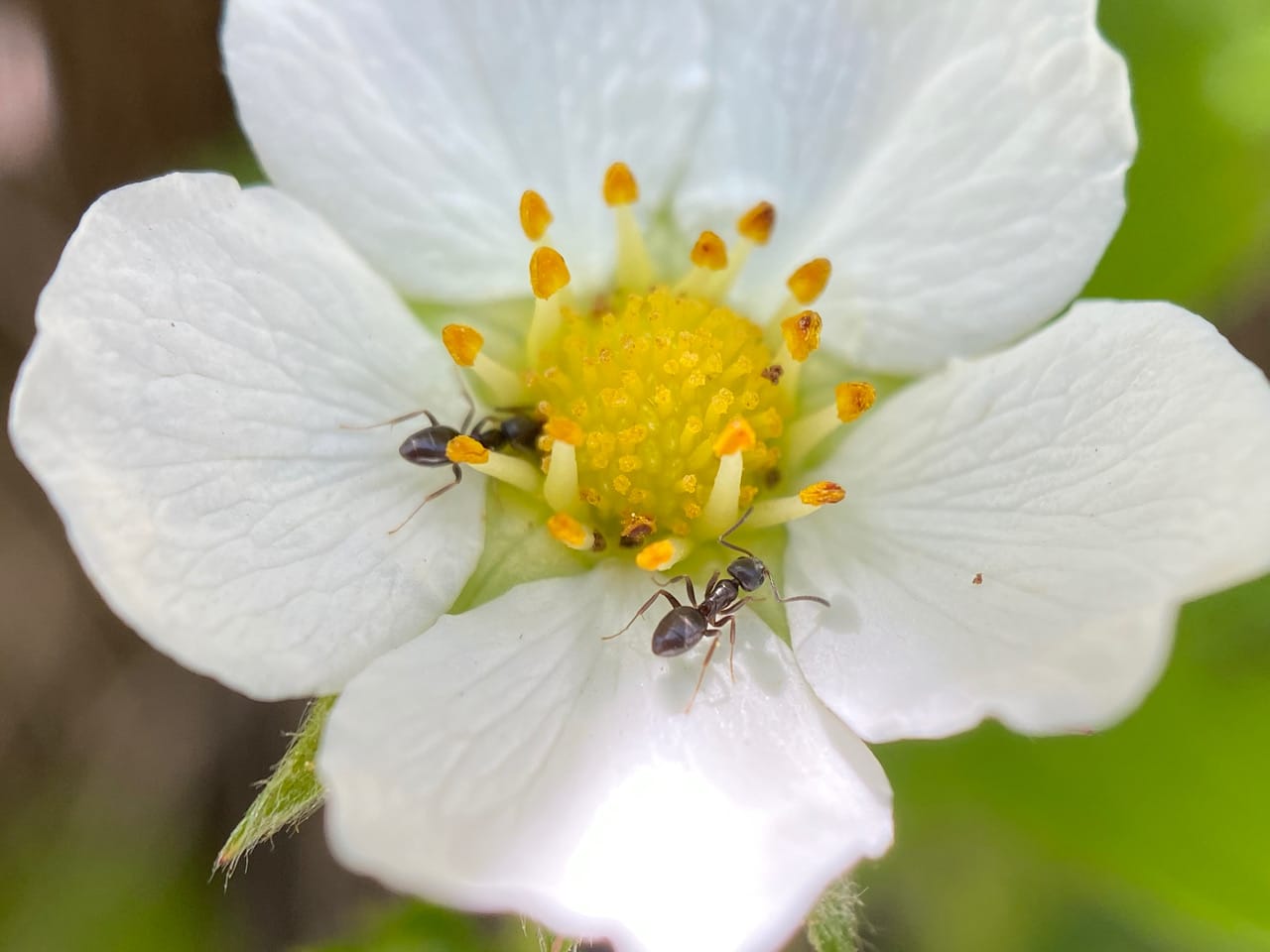 The fading Wood Strawberry flower, Fragaria vesca (family Rosaceae) no longer has pollen to offer, but it is still attractive to these Odorous House Ants, Tapinoma sessile searching for nectar at the base of the flower.